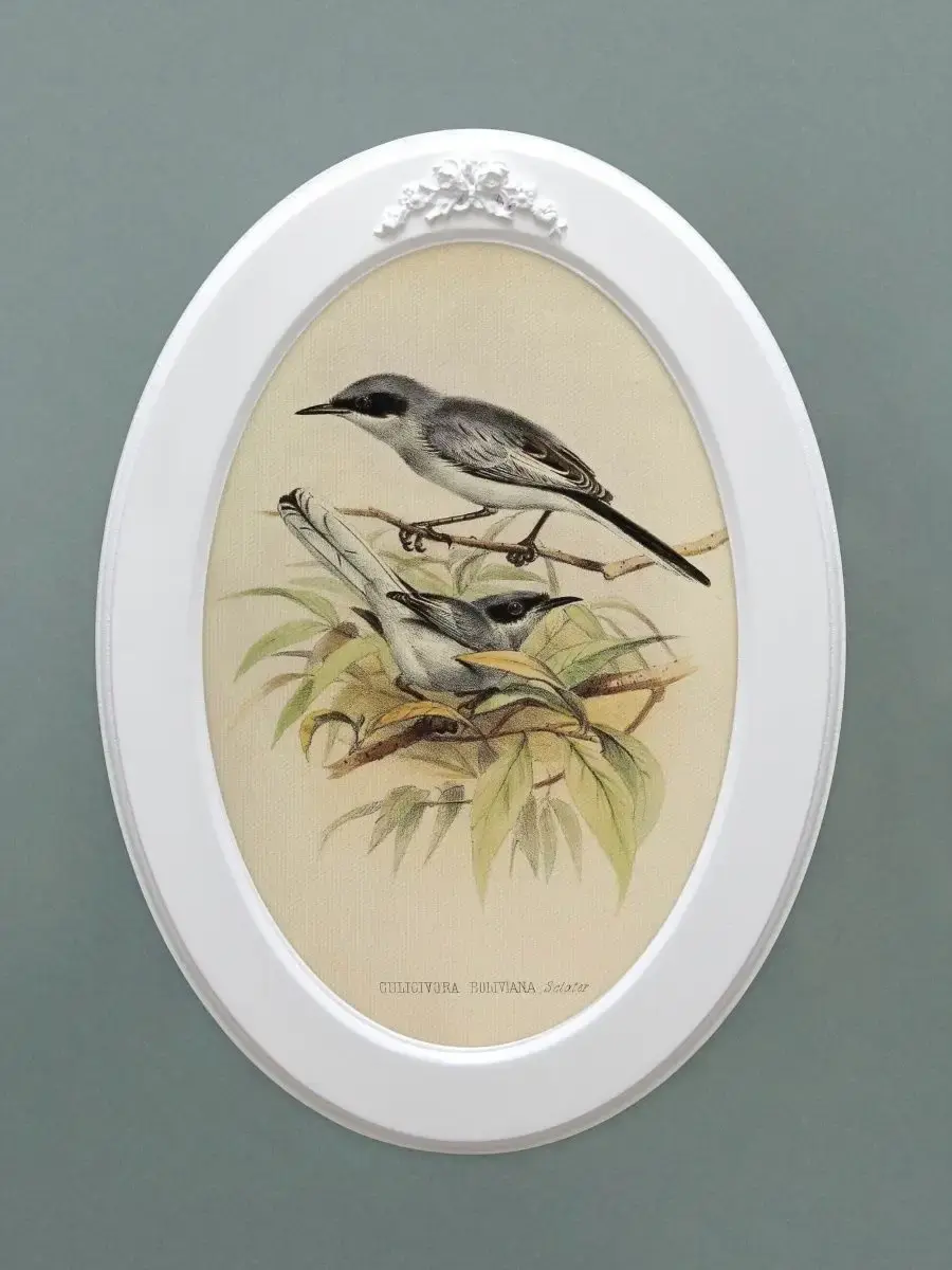 Настенный декор "Винтажные птички" в нежных пастельный тонах. Картина напечатана на натуральном холсте, покрыта матовым лаком для защиты от солнца и пыли, в овальной белой раме с лепниной ручной работы. Картина с птичками станет прекрасным подарком и украшением интерьера дома, на даче или в офисе. Множество вариантов дает возможность создать собственную коллекцию, украсить стены спальни, в кухне, прихожей или детской комнате. Рама изготовлена из цельного листа МДФ 10 мм, не имеет зазоров и стыков. Оформляя интерьер картинами не большого размера в одном стиле Вы создаете уютную атмосферу в доме. Коллекцию картин можно все время пополнять или обновлять новми сюжетами , создавая настроение. Птицы подойдут для интерьера в стиле Прованс, Шеббишик, Классика. Окрашена рама экологичной акриловой эмалью в белый цвет. Размер картины 27х37 см, размер изображения 20х30 см. Крепление для стены в комплекте.