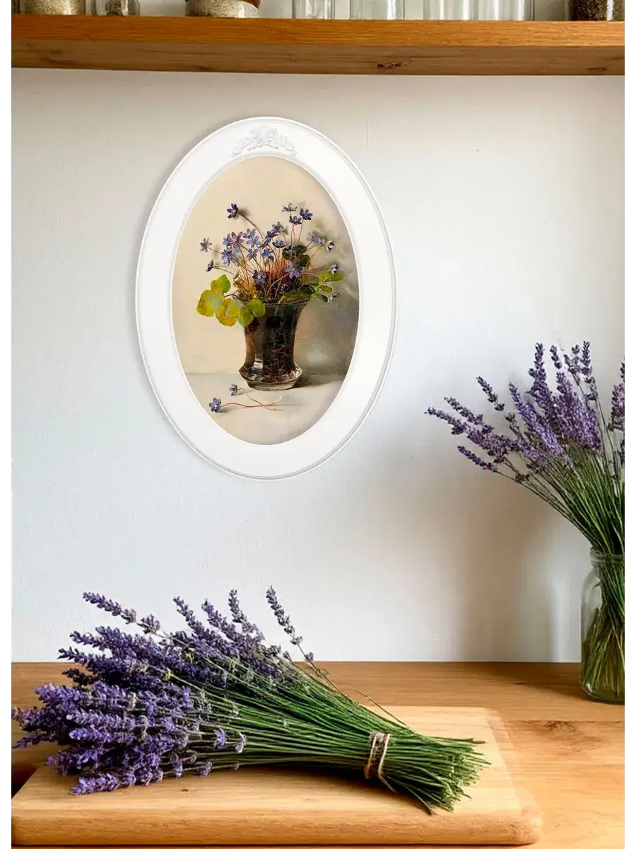 Картина напечатана на натуральном холсте, покрыта матовым лаком, оформлена в овальную белую раму с лепниной. Картина станет прекрасным украшением интерьера. Множество вариантов дает возможность создать собственную коллекцию. Картины для украшения в стиле Прованс или для детской комнаты.