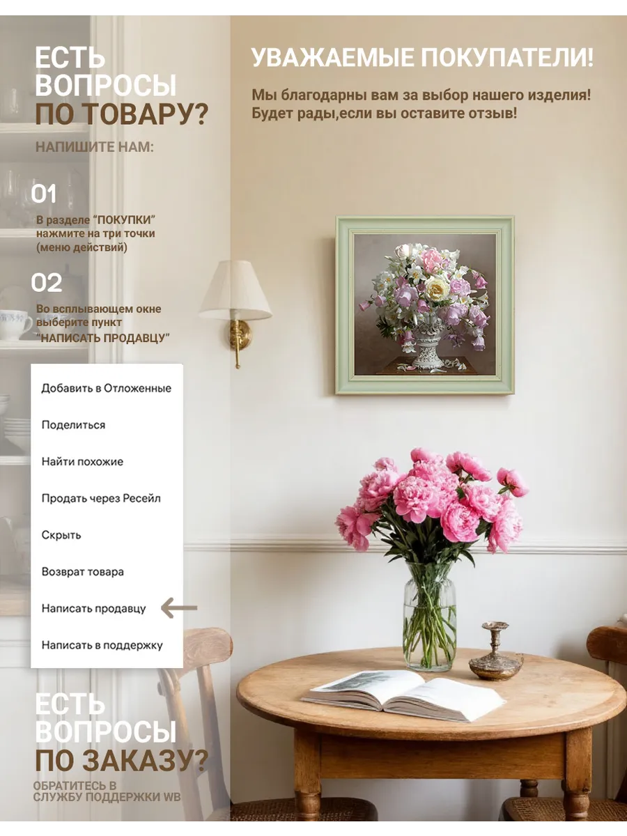 Картина на натуральном холсте "Розовый букет" от Elenadecor станет изысканным украшением любого интерьера. Эта интерьерная картина размером 37 на 37 см, выполненная на натуральном холсте, порадует вас своей красотой и качеством исполнения. Яркий и реалистичный рисунок цветов и растений, изображённых на картине, создаст в вашем доме атмосферу уюта и тепла. Картина поставляется в классической раме мятного цвета, что придает ей завершенный и элегантный вид. Благодаря удобному креплению, ее легко повесить на стену в гостиной, спальне, прихожей или в любом другом помещении. "Розовый букет" станет прекрасным дополнением к вашей коллекции картин и подарит вам эстетическое наслаждение каждый день.