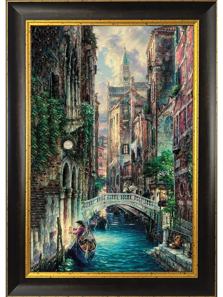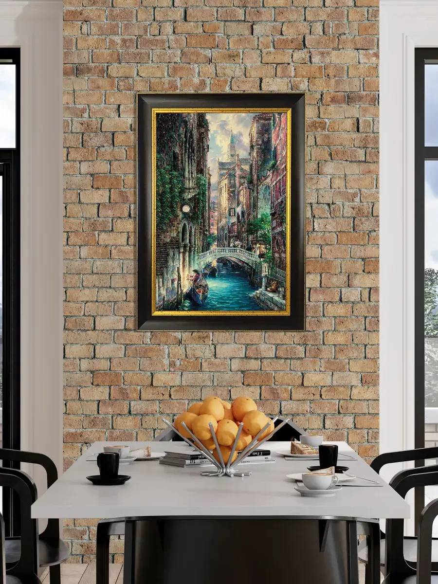 Картина большая напечатана на натуральном холсте, покрыта матовым лаком, рама из полиуретана. Размер холста 30*45см. Картины в темной коричневой раме с золотом с городскими пейзажами, улочками Венеции прекрасный настенный декор для дома и офиса. Можно собрать коллекцию из нескольких картин и оформить большую стену. Основа из ХДФ, что исключает провисание холста. Красивая багетная рама из полиуретана с золотой патиной. Крепления для стены в комплекте, зубчатый крепеж на раме . Размер картины с рамой 37*52 см.