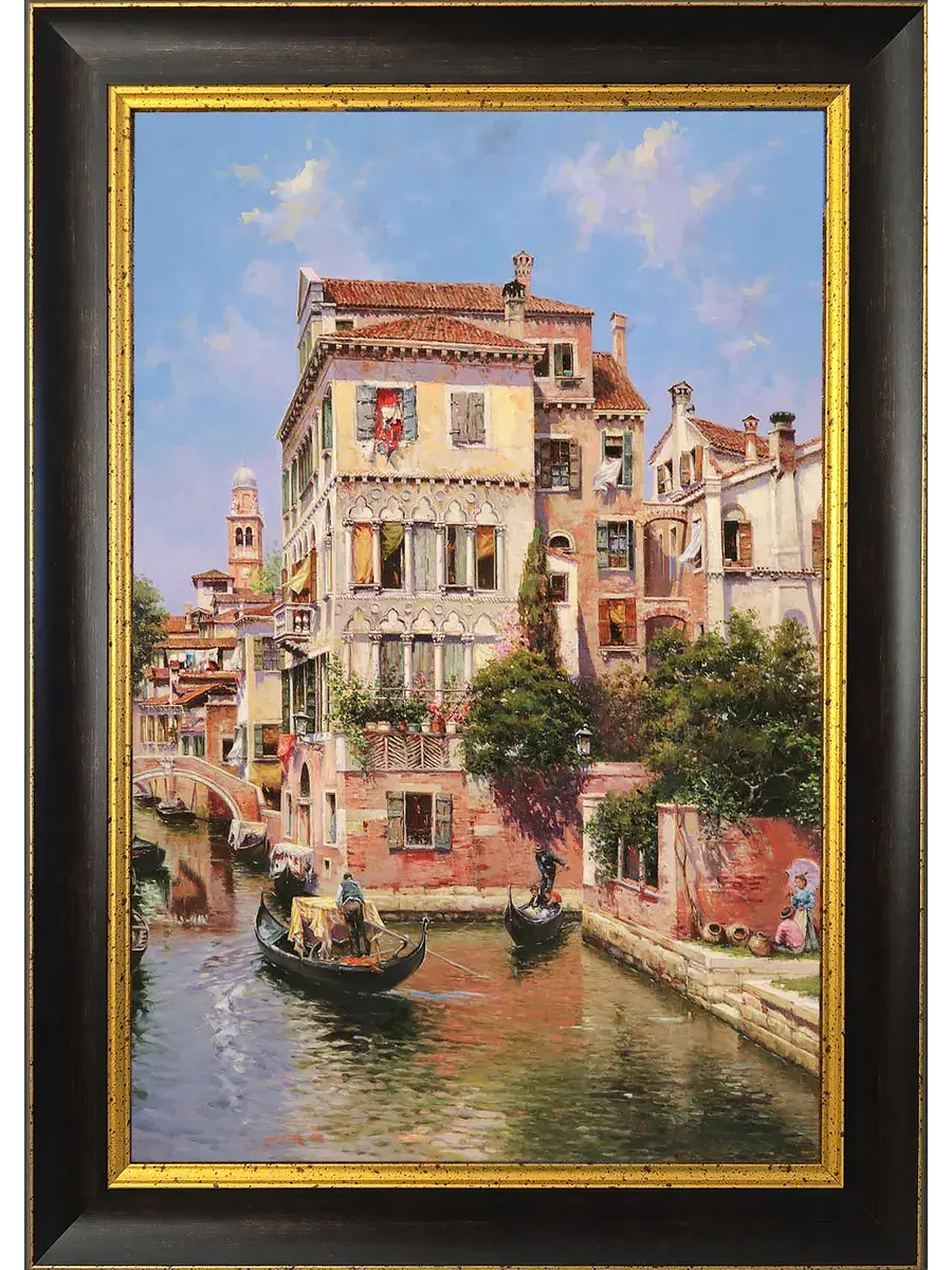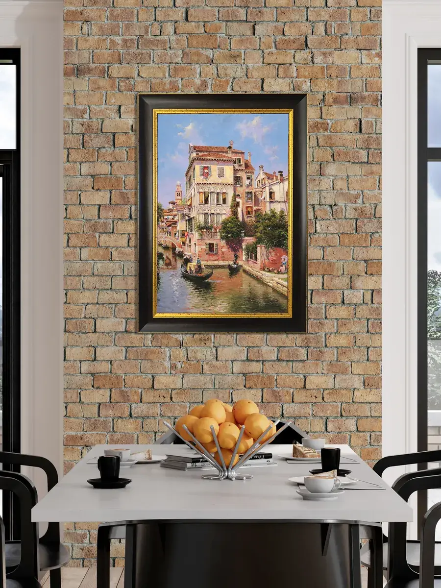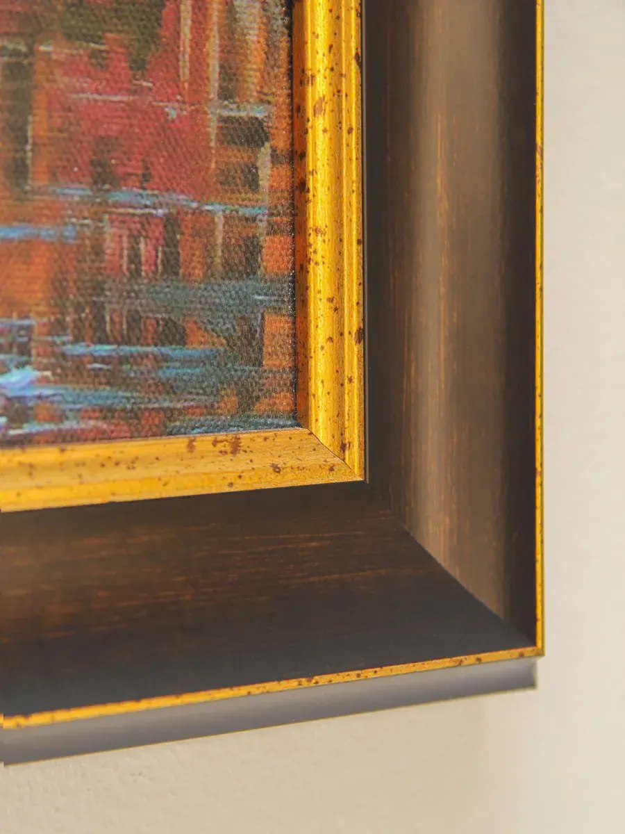 Картина большая напечатана на натуральном холсте, покрыта матовым лаком, рама из полиуретана. Размер холста 30*45см. Картины в темной коричневой раме с золотом с городскими пейзажами, улочками Венеции прекрасный настенный декор для дома и офиса. Можно собрать коллекцию из нескольких картин и оформить большую стену. Основа из ХДФ, что исключает провисание холста. Красивая багетная рама из полиуретана с золотой патиной. Крепления для стены в комплекте, зубчатый крепеж на раме . Размер картины с рамой 37*52 см.