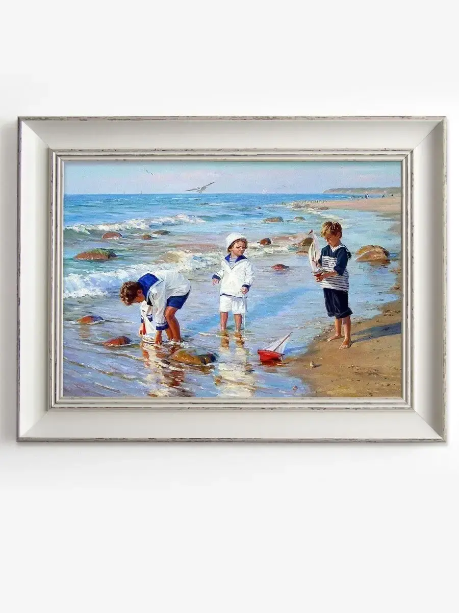 Серия сюжетных картин "Дети на море". Картина настенная для создания коллекций, напечатана на натуральном холсте, покрыта лаком. Для защиты от провисания холст наклеен на хдф. Рама белая, матовая, с не большим эффектом старения. Крепление для стены в комплекте.