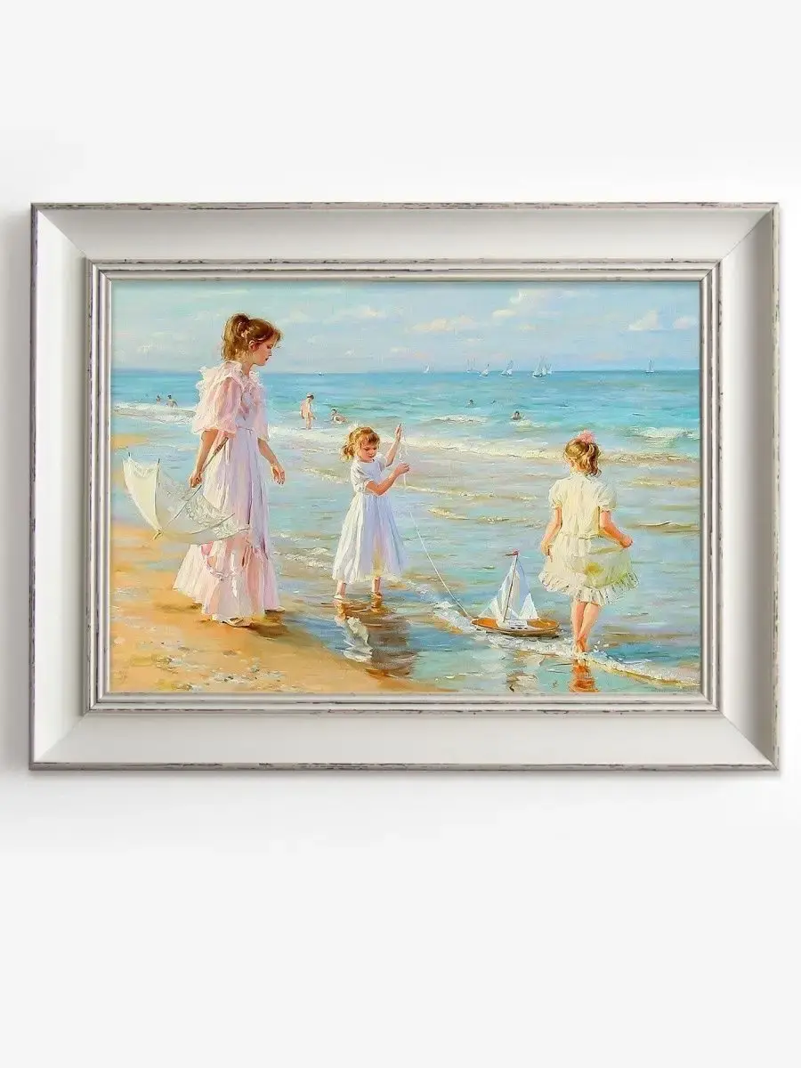 Серия сюжетных картин "Дети на море". Картина настенная для создания коллекций, напечатана на натуральном холсте, покрыта лаком. Для защиты от провисания холст наклеен на хдф. Рама белая, матовая, с не большим эффектом старения. Крепление для стены в комплекте.