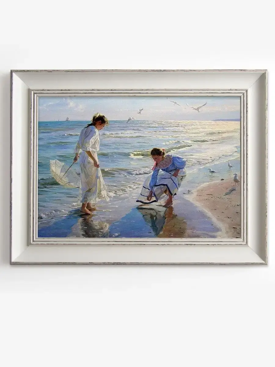 Серия сюжетных картин "Дети на море". Картина настенная для создания коллекций, напечатана на натуральном холсте, покрыта лаком. Для защиты от провисания холст наклеен на хдф. Рама белая, матовая, с не большим эффектом старения. Крепление для стены в комплекте.