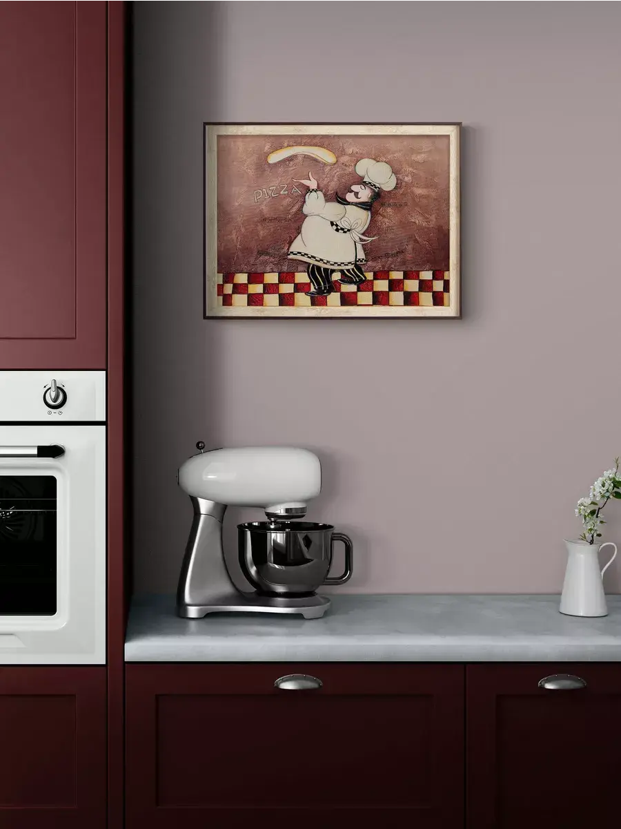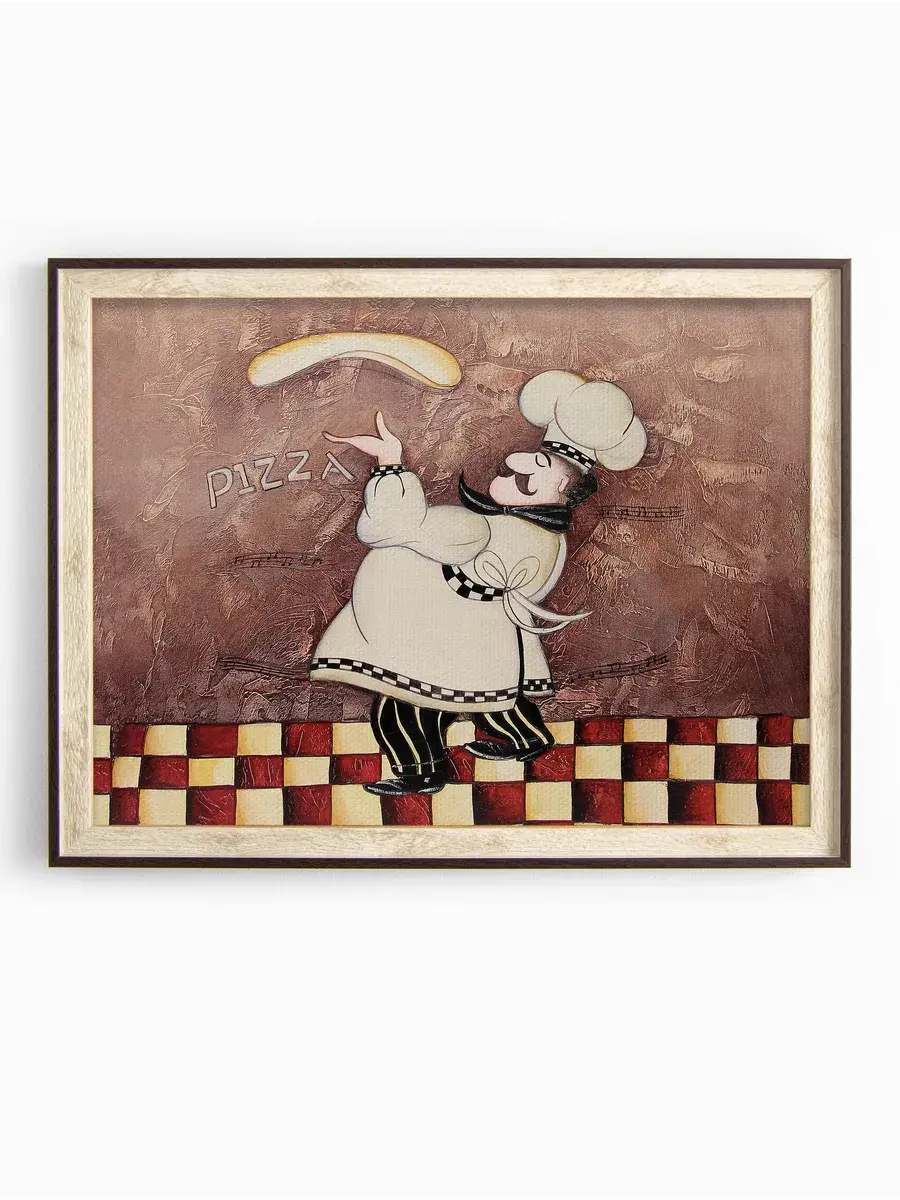 Настенный декор - картина с винтажными поварами в лаконичной бежевой раме с коричневым кантом. Картина напечатана на натуральном холсте, покрыта матовым лаком станет прекрасным дополнением и украшением интерьера. Панно на стену украсит и дополнит интерьер кухни, столовой, кафе. Милый сувенир. Рама изготовлена из полиуретана. Размер картины 33*43 см размер изображения 30*40 см. Крепление для стены в комплекте.