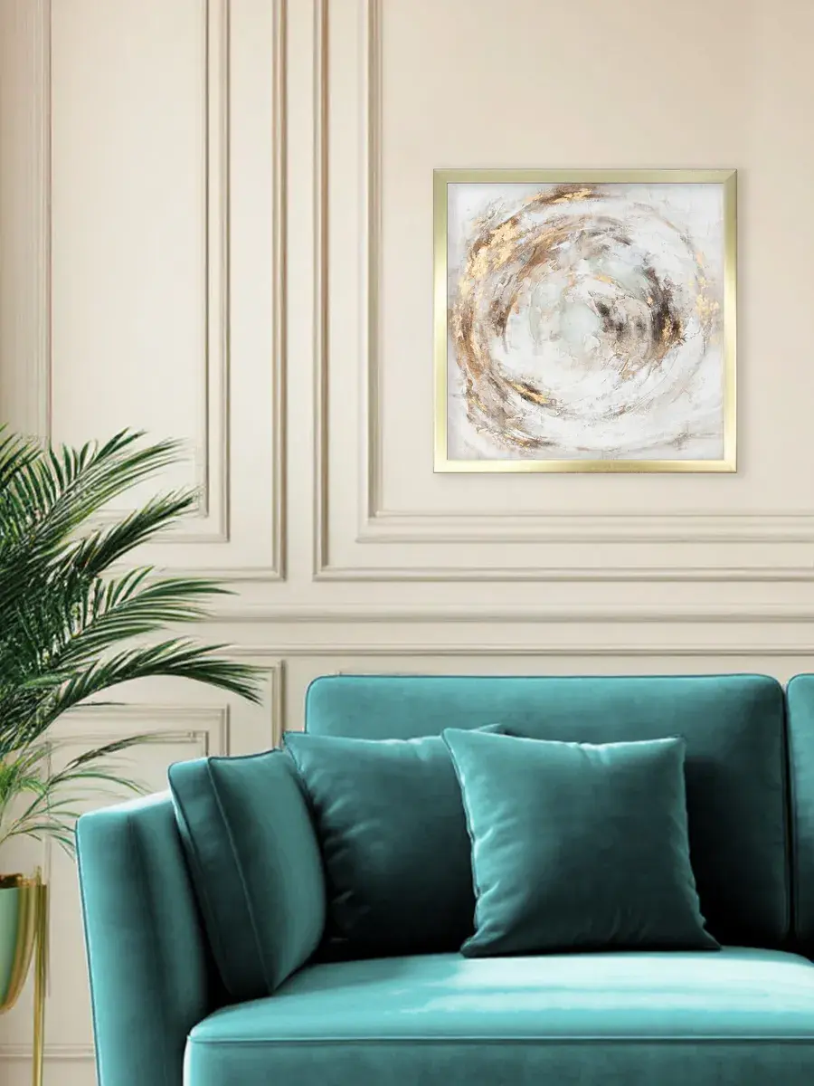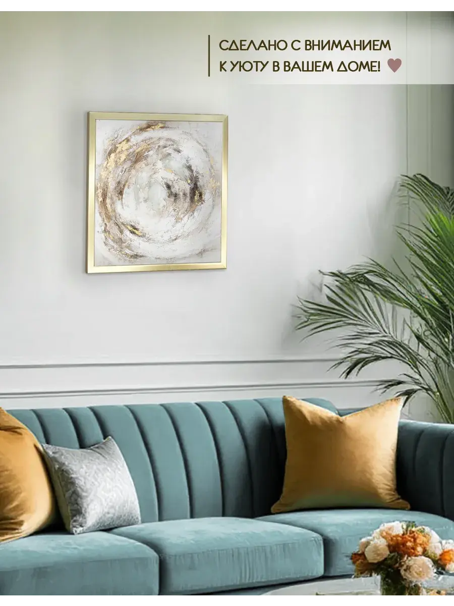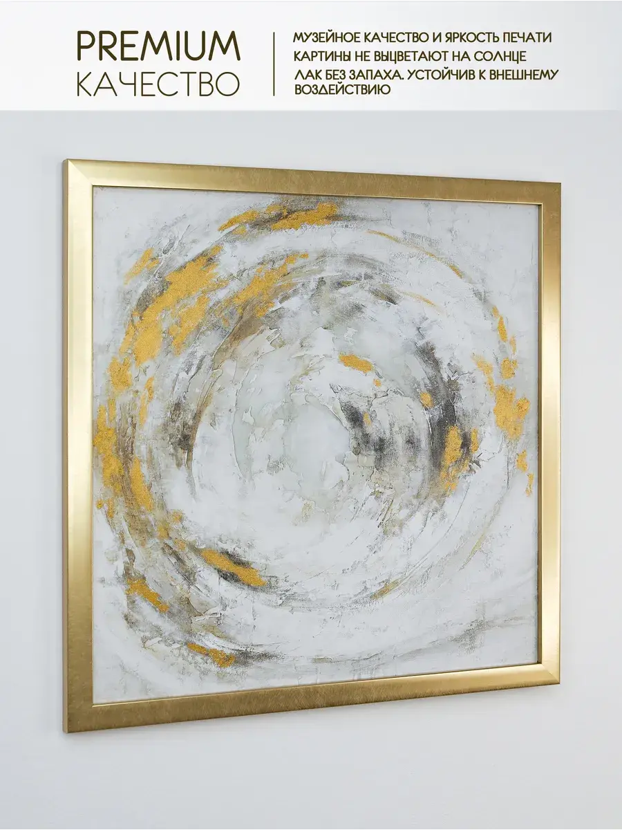 Картина напечатана на натуральном холсте, подрисовка золотой патиной, покрыта лаком. Основа для холста из ХДФ, что исключает провисание холста. Размер картины с рамой 43*43 см