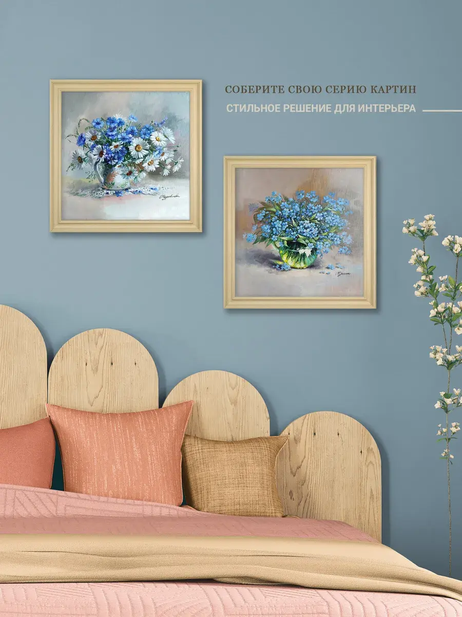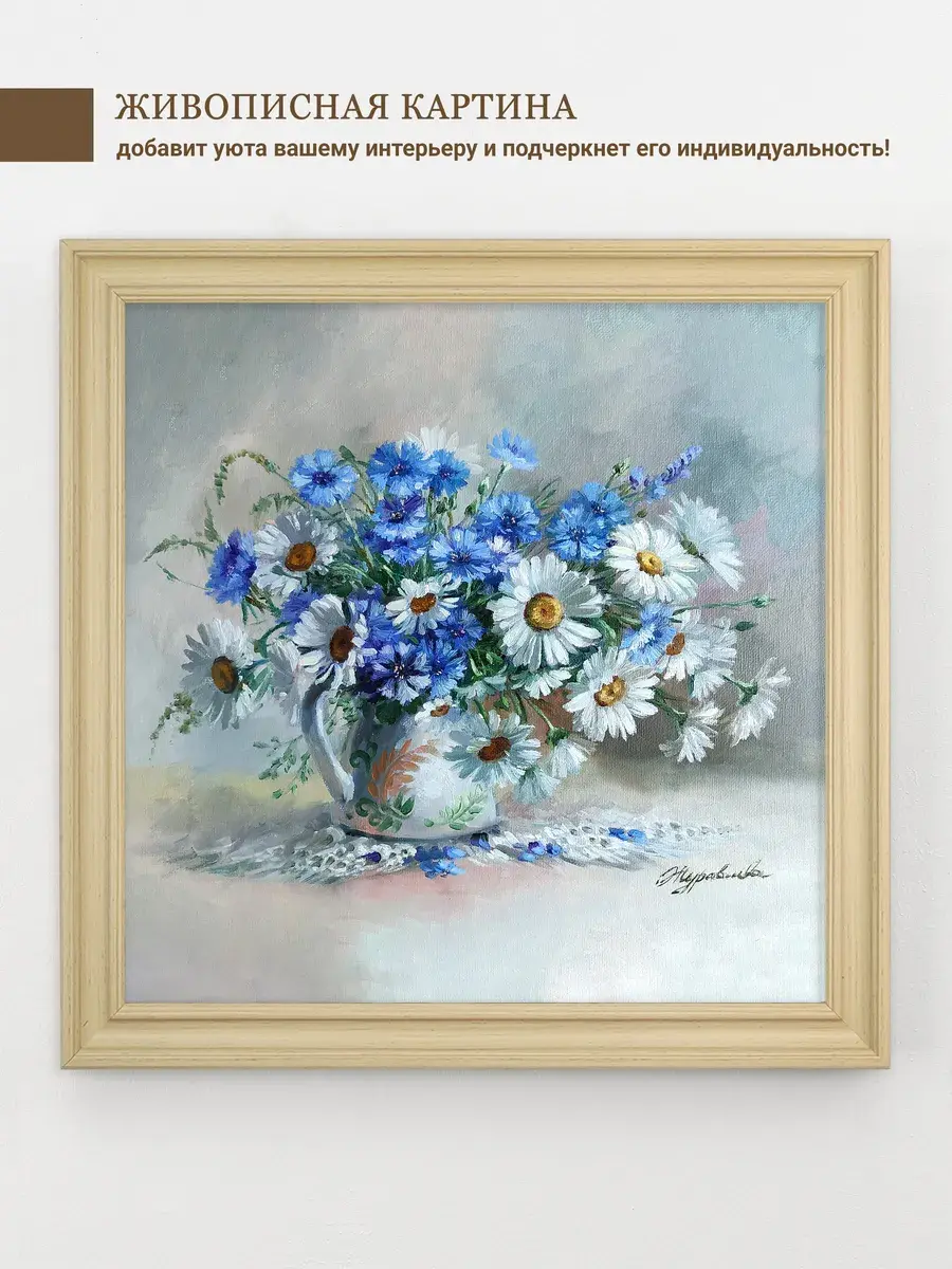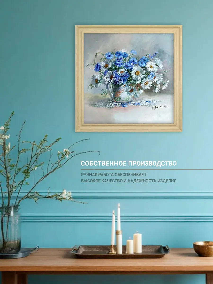 ВНИМАНИЕ! В этой серии изменился багет. Новые фото будут в ближайшее время! Удивительно-красивая картина "Васильки" в пастельных тонах для создания коллекции в классическом стиле. Украшение для стен дома, оформления кабинета на работе, для создания уютной атмосферы на даче. Картины в светлой бежевой лаконичной раме подойдет для оформления стен в кафе и ресторане. Картина напечатана на натуральном холсте в галерейном качестве, покрыта лаком. Для защиты от провисания холст наклеен на хдф. Рама широкая из полиуретана, матовая по дерево. Размера холст 40*40 см. Ширина рамы 3,5 см. Картина - прекрасный подарок на день рождения, новоселье и просто так для себя. Картина настенная готовая в раме. Крепление для стены в комплекте.