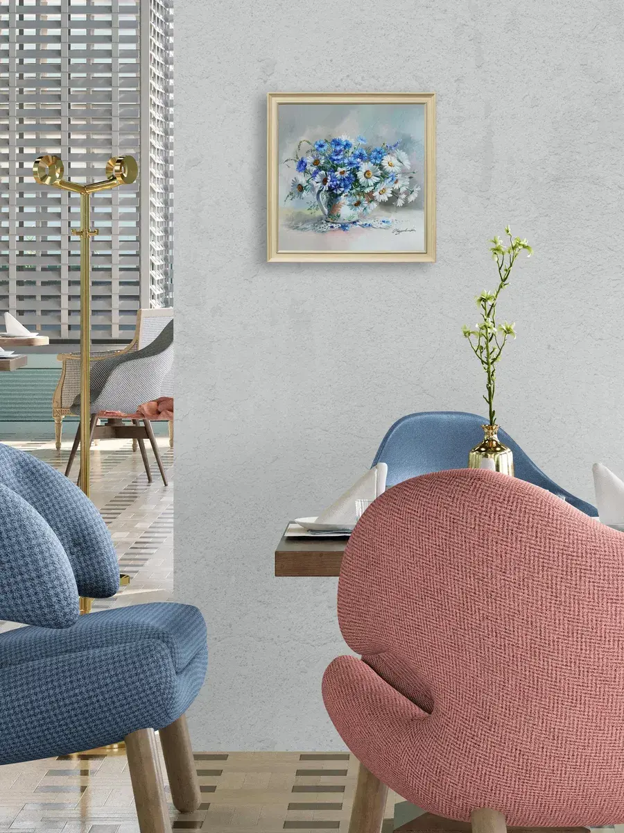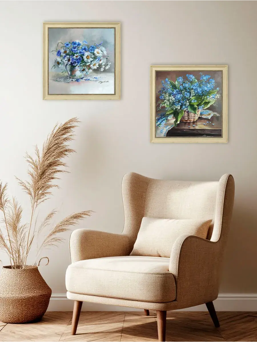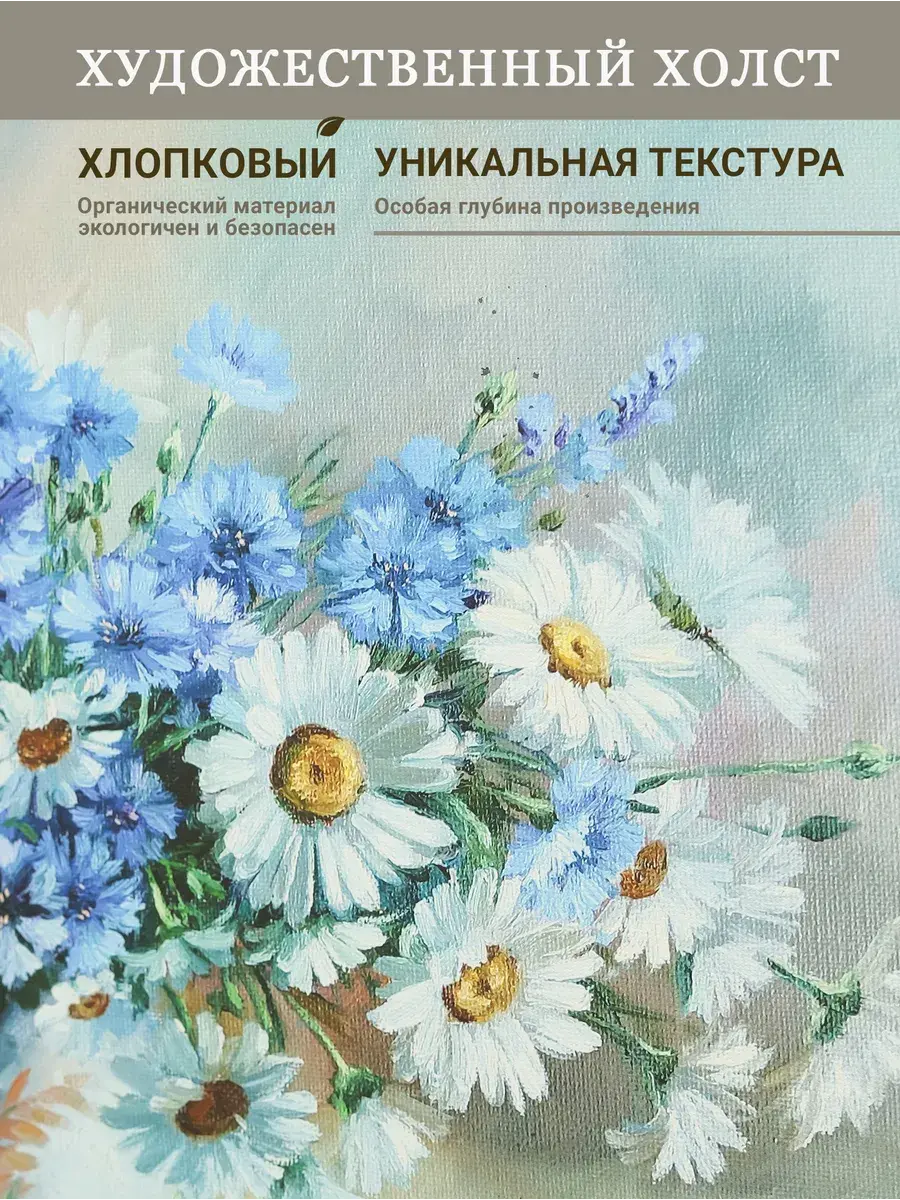 ВНИМАНИЕ! В этой серии изменился багет. Новые фото будут в ближайшее время! Удивительно-красивая картина "Васильки" в пастельных тонах для создания коллекции в классическом стиле. Украшение для стен дома, оформления кабинета на работе, для создания уютной атмосферы на даче. Картины в светлой бежевой лаконичной раме подойдет для оформления стен в кафе и ресторане. Картина напечатана на натуральном холсте в галерейном качестве, покрыта лаком. Для защиты от провисания холст наклеен на хдф. Рама широкая из полиуретана, матовая по дерево. Размера холст 40*40 см. Ширина рамы 3,5 см. Картина - прекрасный подарок на день рождения, новоселье и просто так для себя. Картина настенная готовая в раме. Крепление для стены в комплекте.