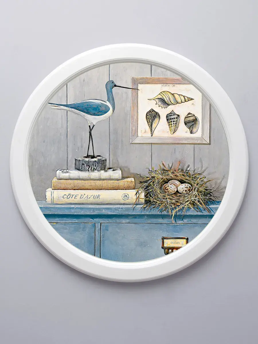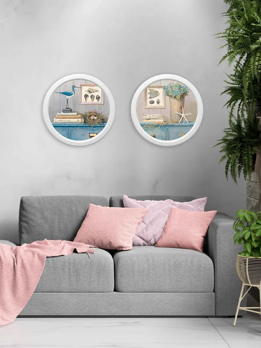 Настенный декор в нежных пастельных тонах с сюжетами в морской тематике в белой раме.