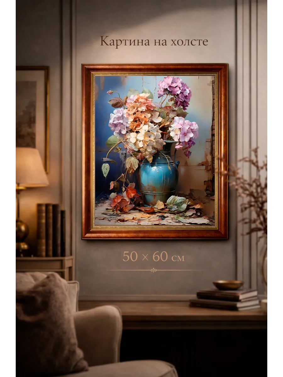 Размер 50×60 см делает картину универсальной — она гармонично смотрится как на стене самостоятельно, так и в композиции из нескольких картин.