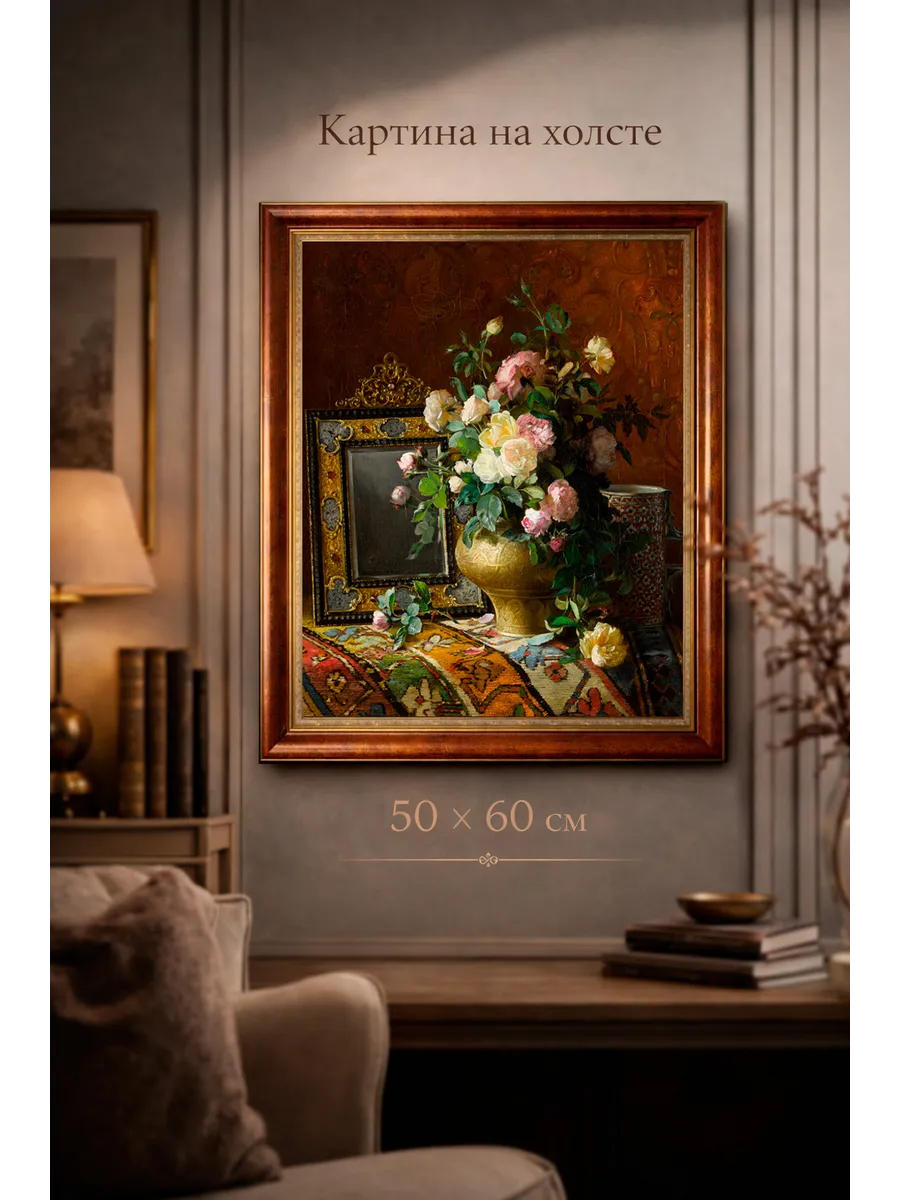 Элегантная картина с роскошной композицией цветов станет выразительным акцентом в интерьере и добавит пространству ощущение уюта, гармонии и благородства. Классический сюжет с нежными розами идеально подходит для оформления гостиной, спальни, кухни или кабинета, делая интерьер более тёплым и атмосферным.