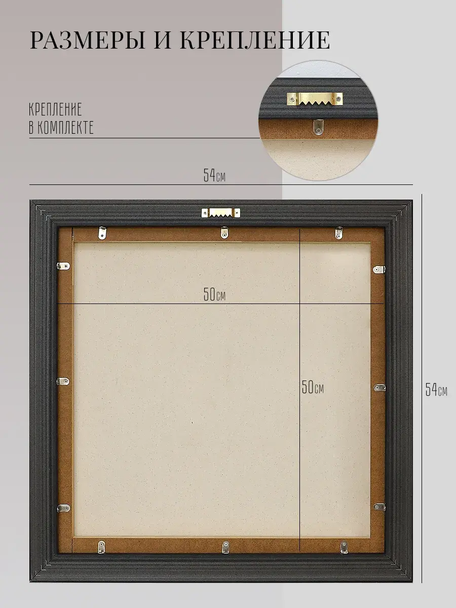Благодаря креплению на обратной стороне, ее легко повесить на стену и наслаждаться ее красотой. Размер картины с рамой 54*54 см