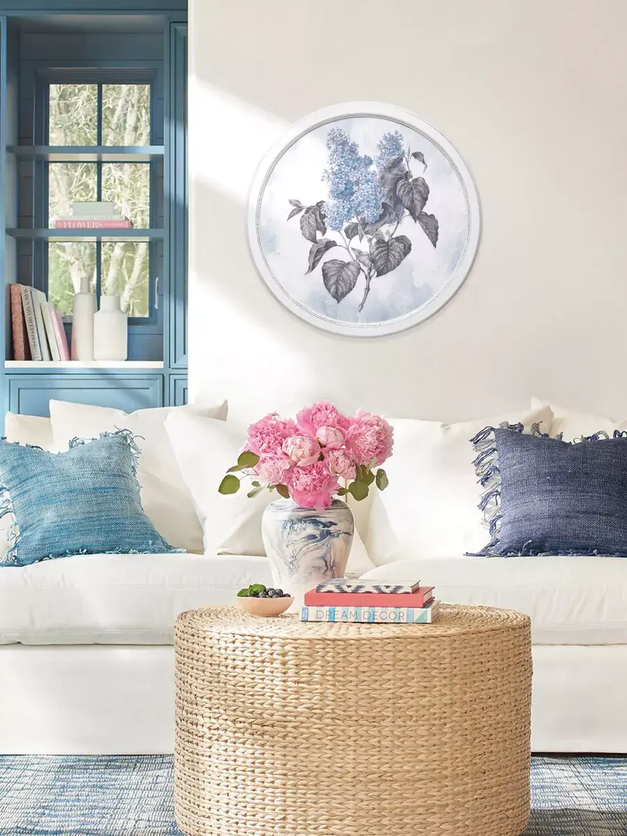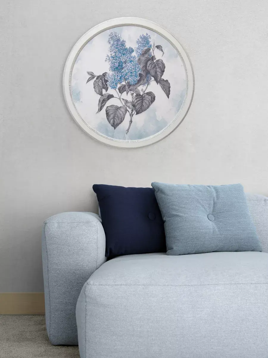 Настенный декор в нежных пастельных тонах с изящными цветами в белоснежной раме. Картина напечатана на натуральном холсте, покрыта матовым лаком в круглой белой раме, станет прекрасным украшением интерьера.