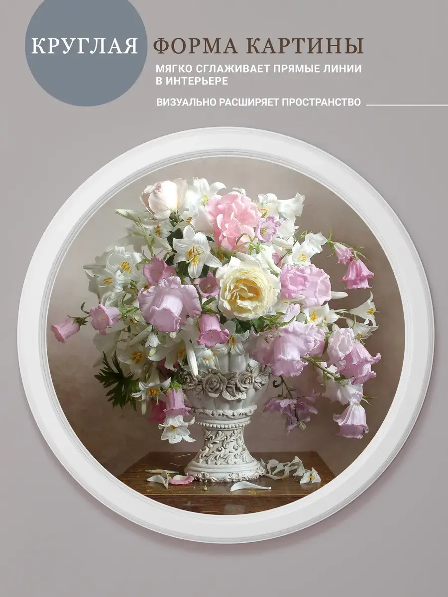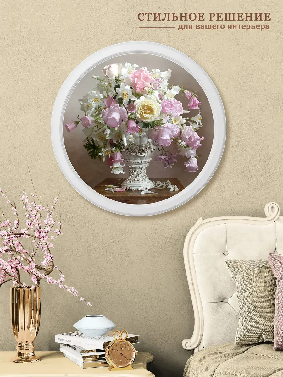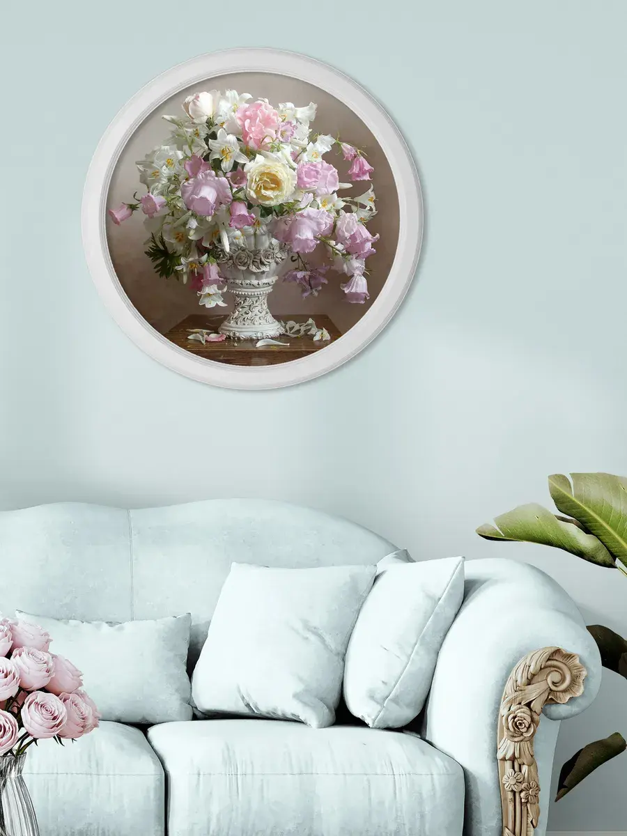 Настенный декор в нежных пастельных тонах с изящными цветами в белоснежной раме. Картина напечатана на натуральном холсте, покрыта матовым лаком в круглой белой раме, станет прекрасным украшением интерьера.