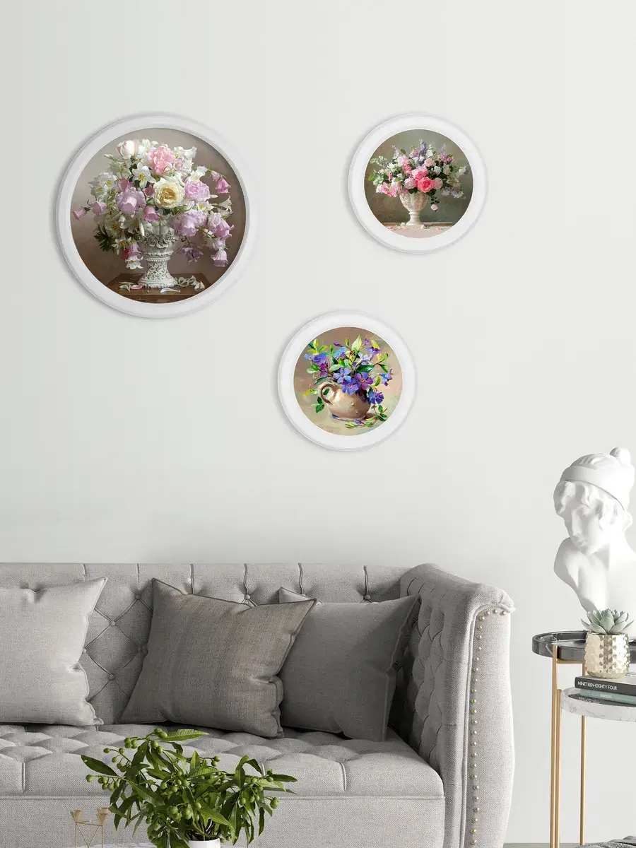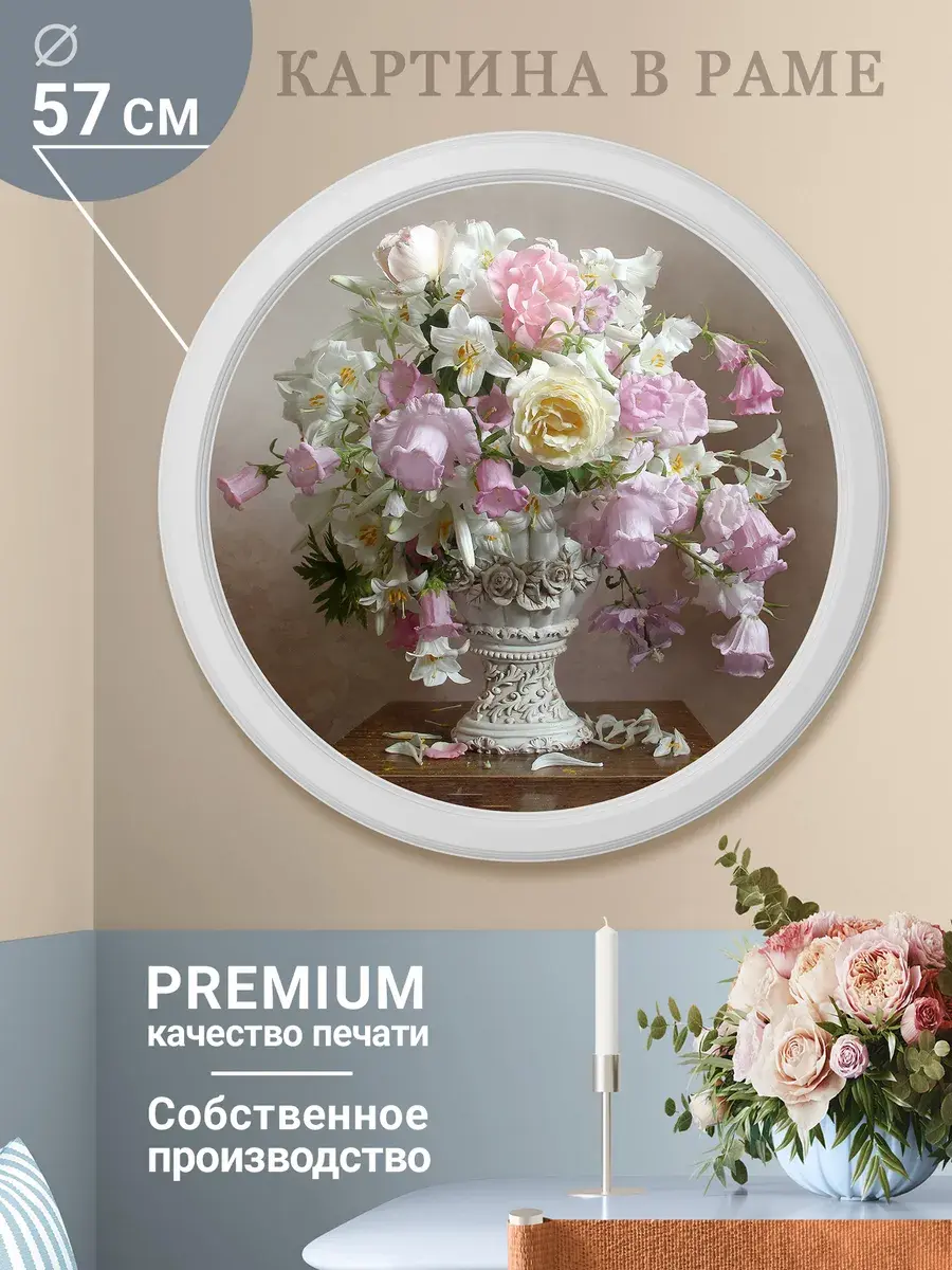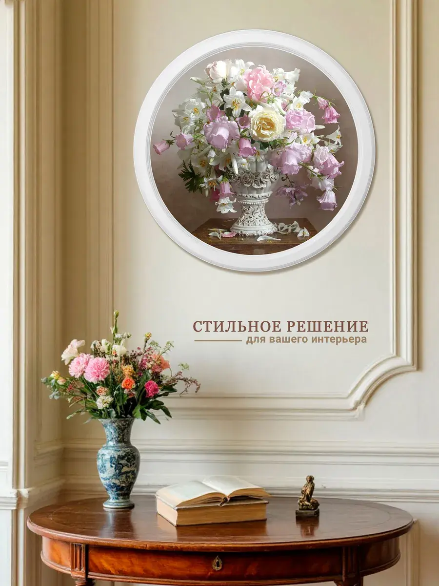 Настенный декор в нежных пастельных тонах с изящными цветами в белоснежной раме. Картина напечатана на натуральном холсте, покрыта матовым лаком в круглой белой раме, станет прекрасным украшением интерьера.