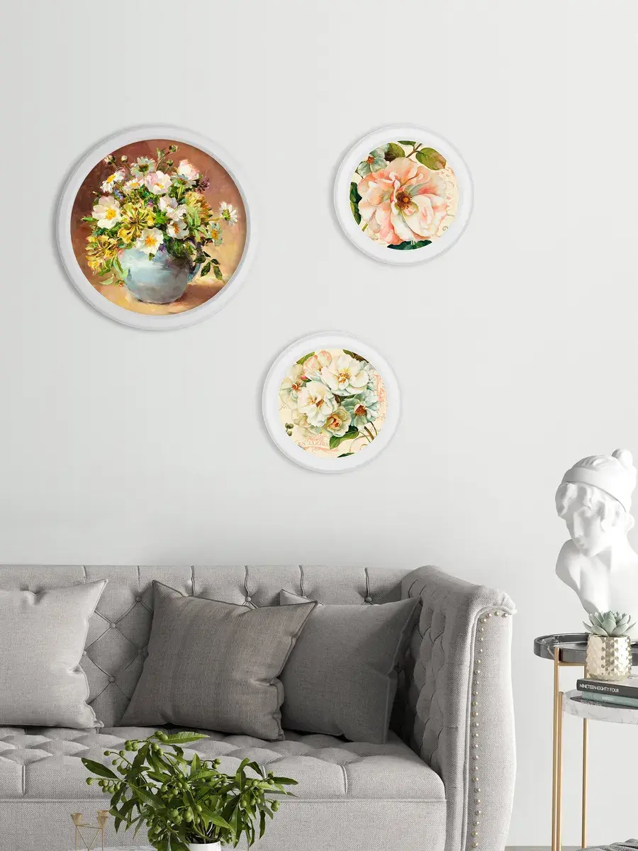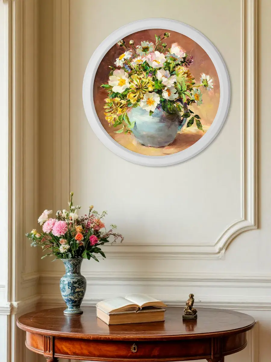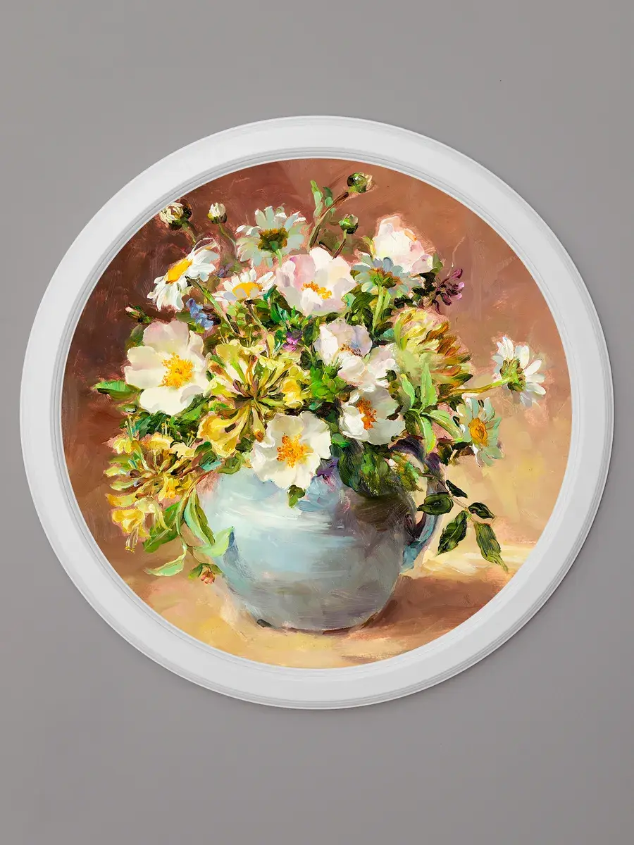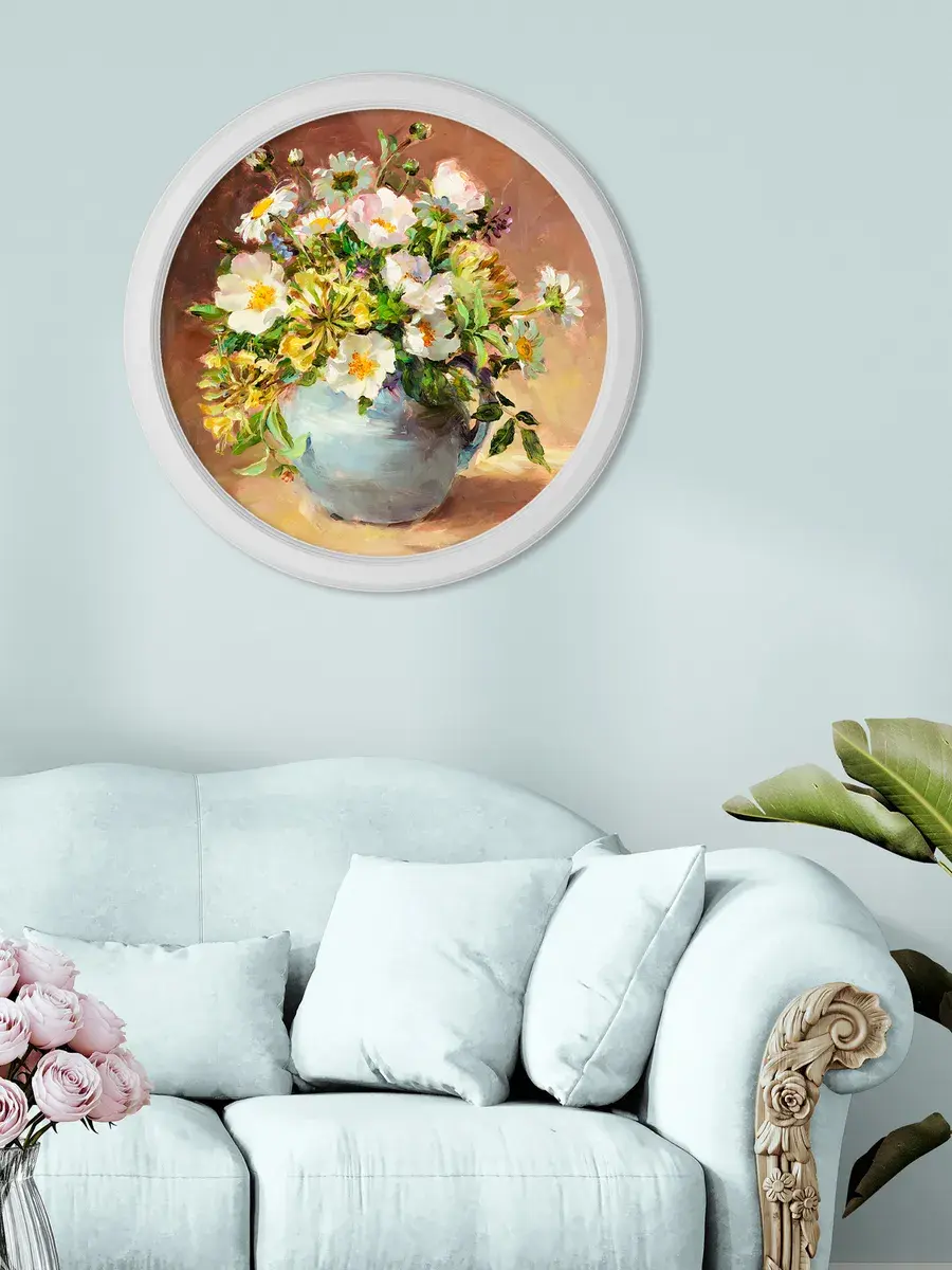 Настенный декор в нежных пастельных тонах с изящными цветами в белоснежной раме. Картина напечатана на натуральном холсте, покрыта матовым лаком в круглой белой раме, станет прекрасным украшением интерьера.