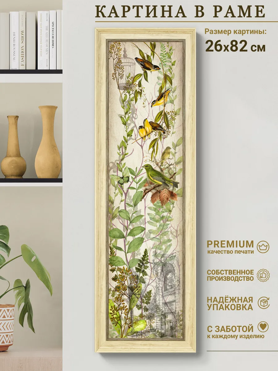 Элегантная интерьерная картина с изображением птиц — изысканное украшение для дома, которое добавит пространству глубины, статуса и утончённости. Вертикальный формат 26×82 см идеально подходит для узких простенков, зон возле шкафа, колонн, прихожей, спальни или гостиной.
