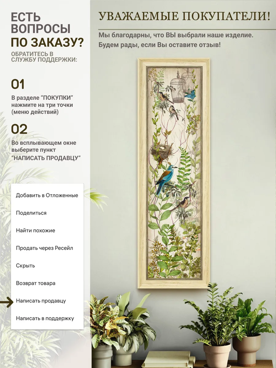 Элегантная интерьерная картина с изображением птиц — изысканное украшение для дома, которое добавит пространству глубины, статуса и утончённости. Вертикальный формат 26×82 см идеально подходит для узких простенков, зон возле шкафа, колонн, прихожей, спальни или гостиной.