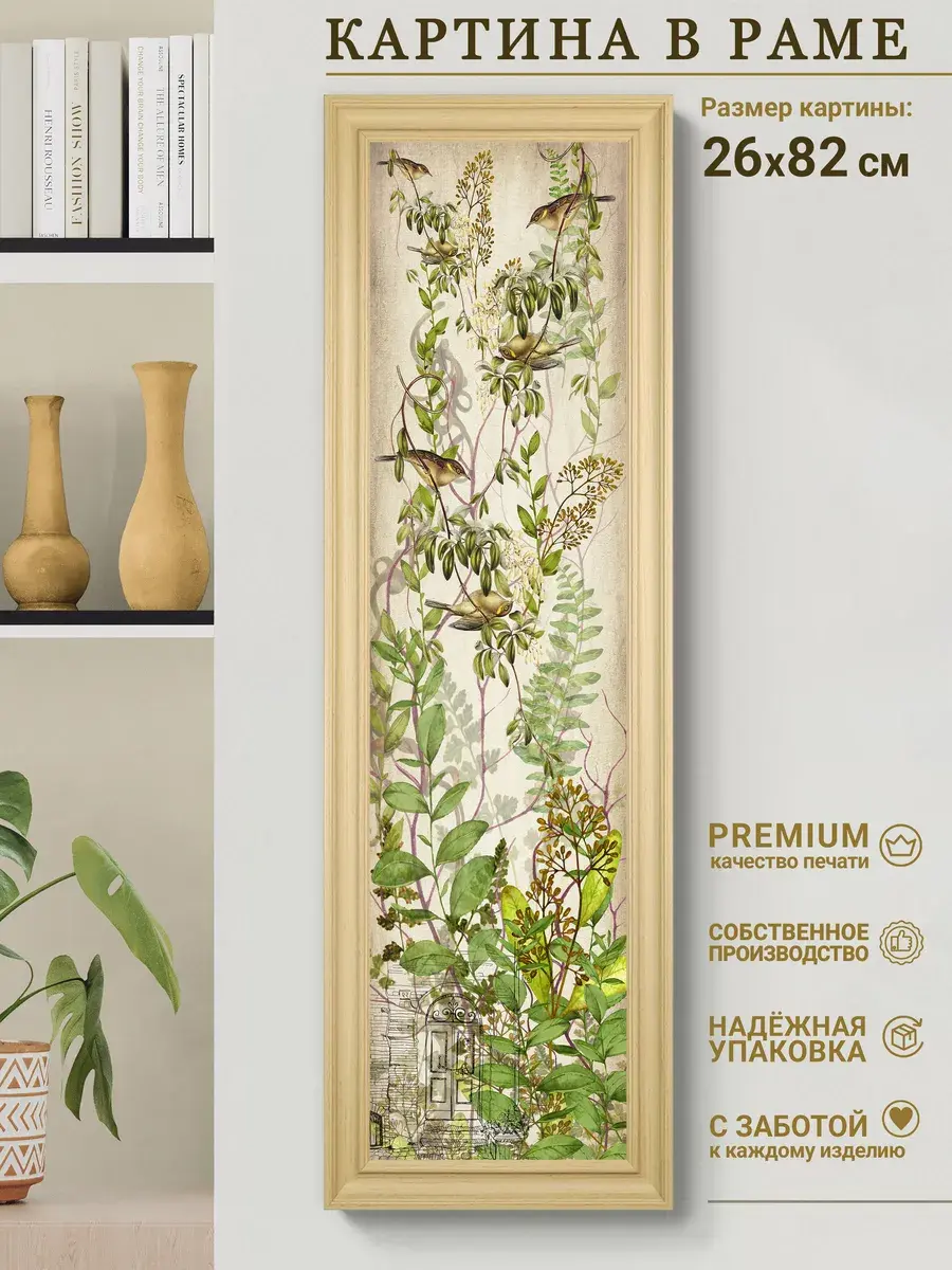Картина напечатана на натуральном холсте в галерейном качестве, покрыта лаком. Для защиты от провисания холст наклеен на хдф. Рама широкая из полиуретана, матовая по дерево. Картина настенная, готовая, в раме. Крепление для стены в комплекте.