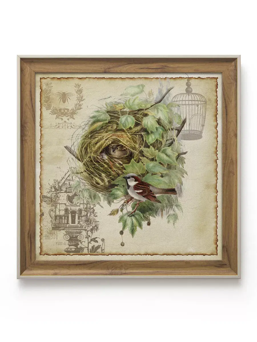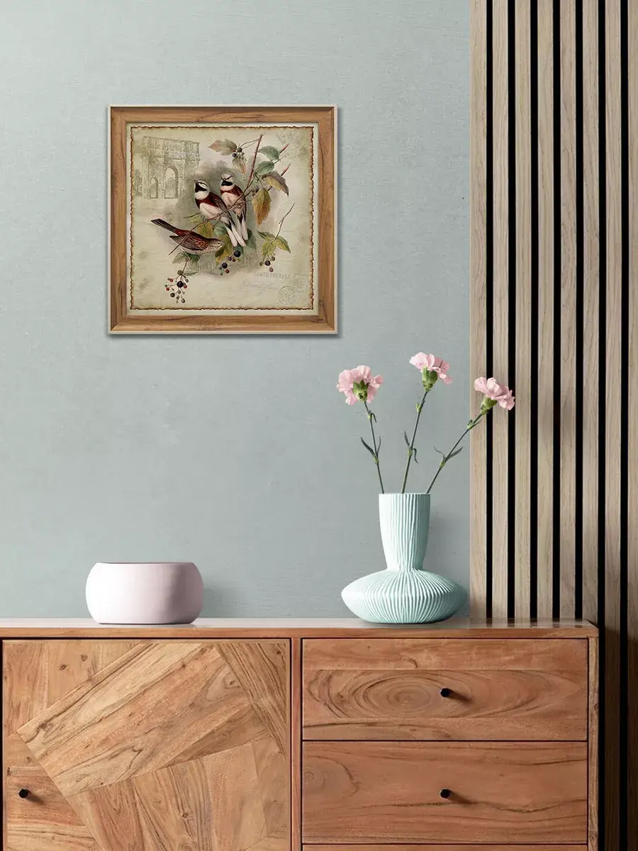 Настенный декор для дома , картина в раме "Птички". Картина напечатана на натуральном холсте, покрыта лаком. Основа из ХДФ, что исключает провисание холста. Багетная рама из полиуретана "под дерево". Размер картины в раме 34,5*34,5 см, холст 30*30 см.