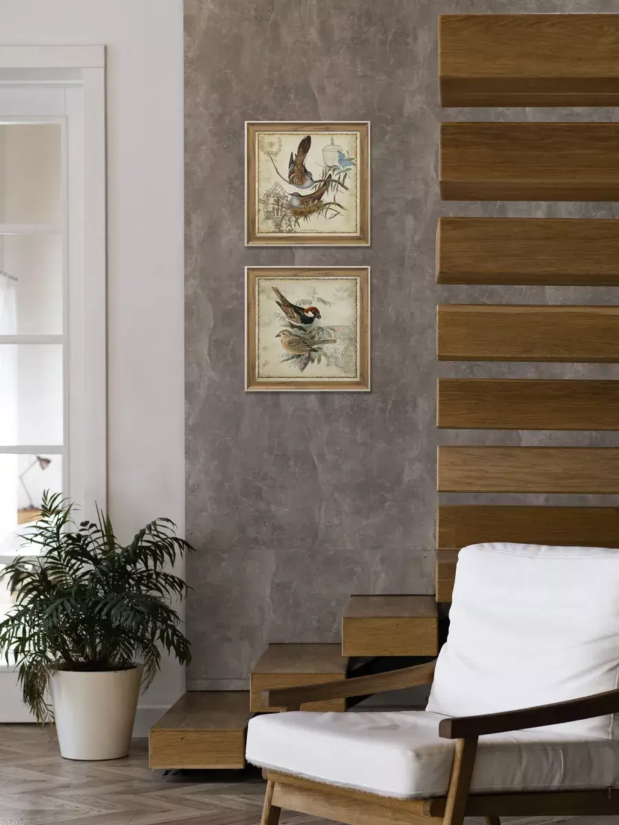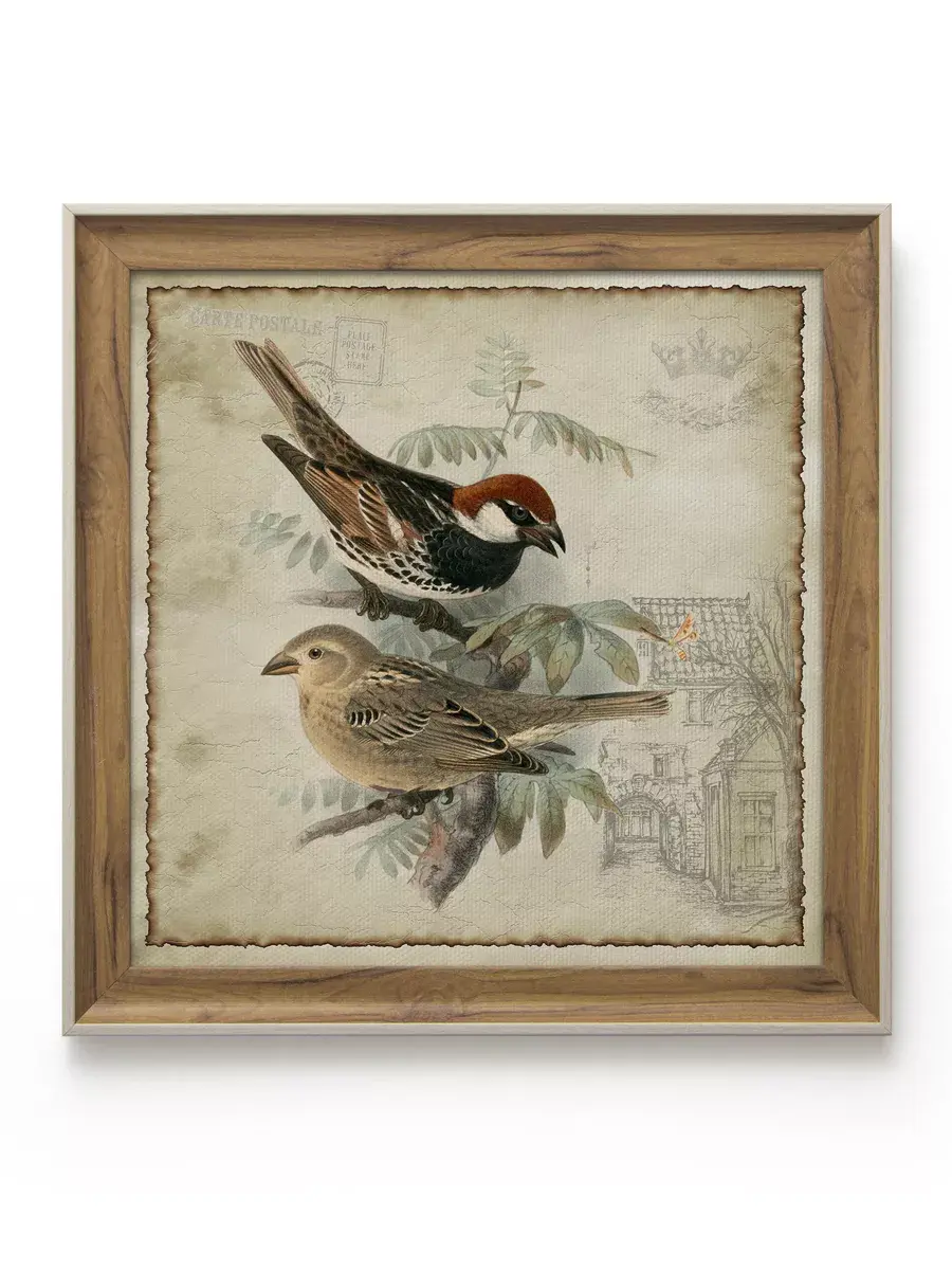 Настенный декор для дома , картина в раме "Птички". Картина напечатана на натуральном холсте, покрыта лаком. Основа из ХДФ, что исключает провисание холста. Багетная рама из полиуретана "под дерево". Размер картины в раме 34,5*34,5 см, холст 30*30 см.