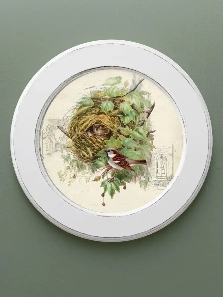 Настенный декор в нежных пастельных тонах с изящными птичками в белой раме с эффектом старения (патина коричневого цвета). Картина напечатана на натуральном холсте, покрыта матовым лаком. Настенная картина в круглой раме станет прекрасным украшением интерьера. Множество вариантов дает возможность создать собственную коллекцию картин с птичками.
