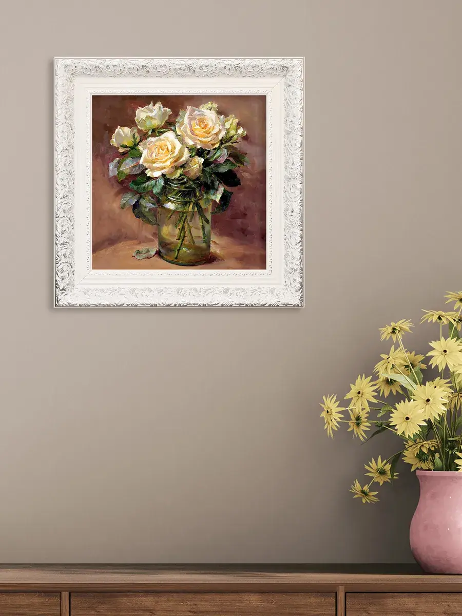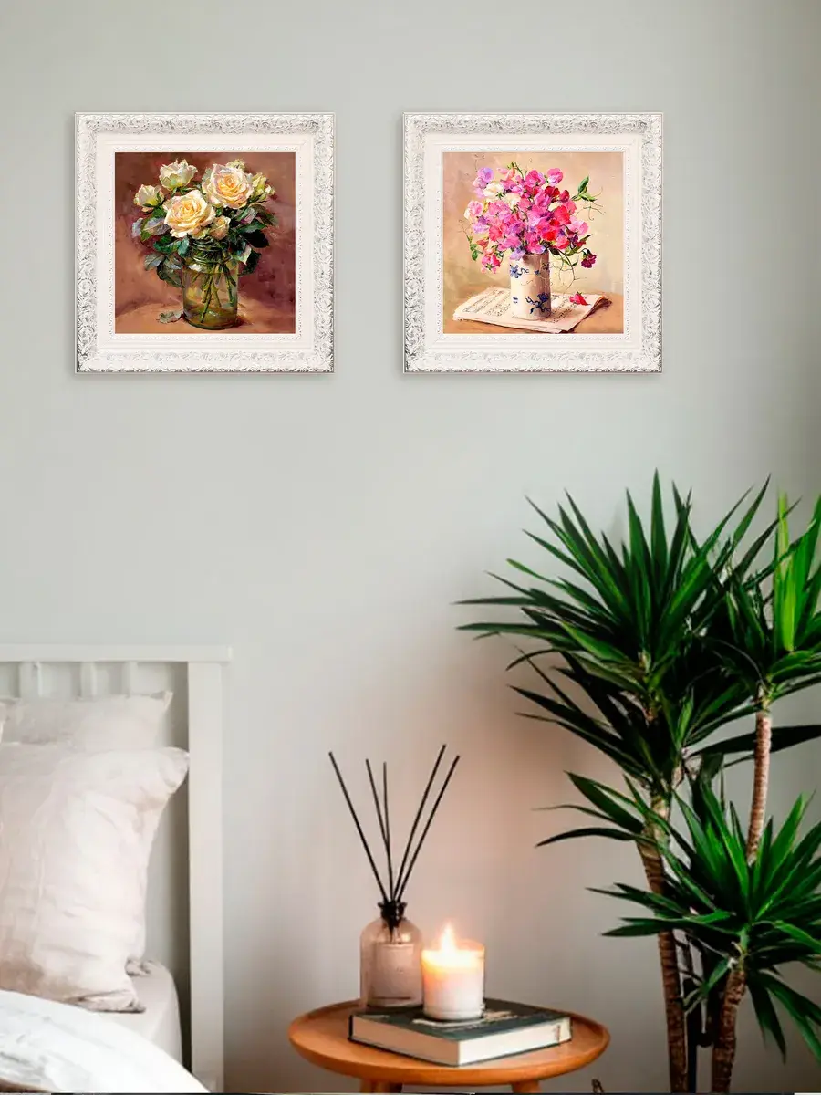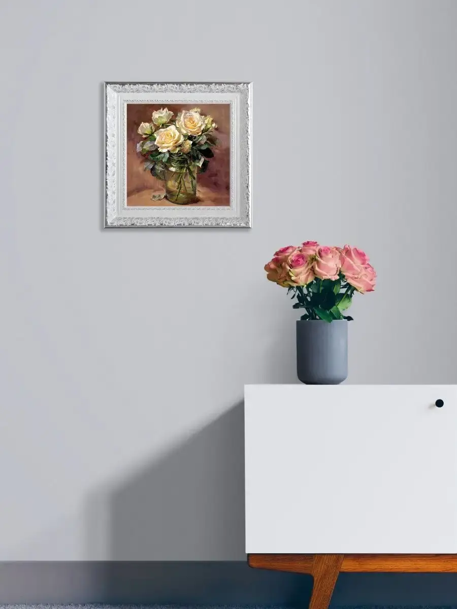 Для картин подходит полочка. Картина напечатана на натуральном холсте, покрыта лаком. Для защиты от провисания холст наклеен на хдф. Рама из полиуретана белоснежная с позолотой. Картины небольшого размера (холст 20*20 см) для создания коллекций. Размер картины с рамой 27х27 см. Коллекция картин идеально подходит к полкам в багетной раме.
