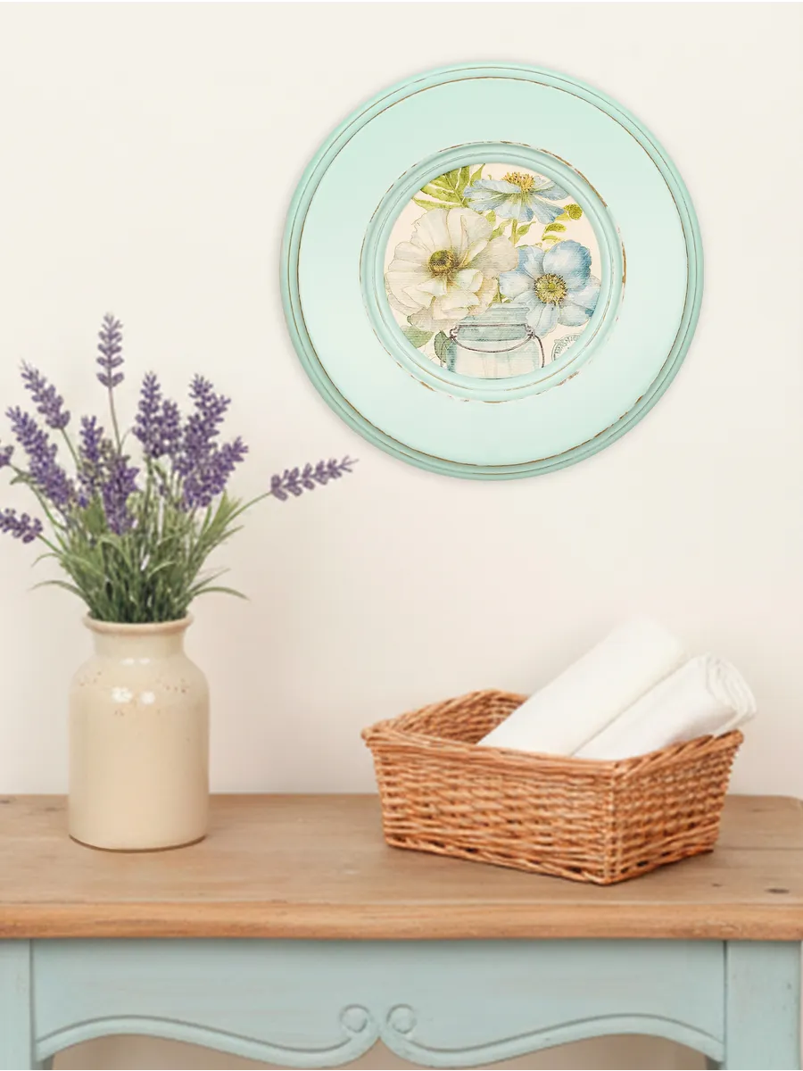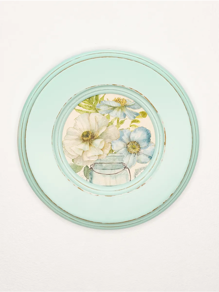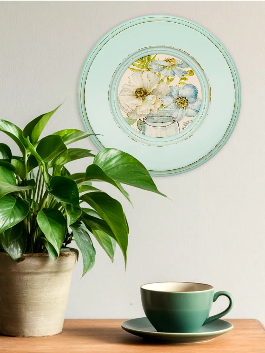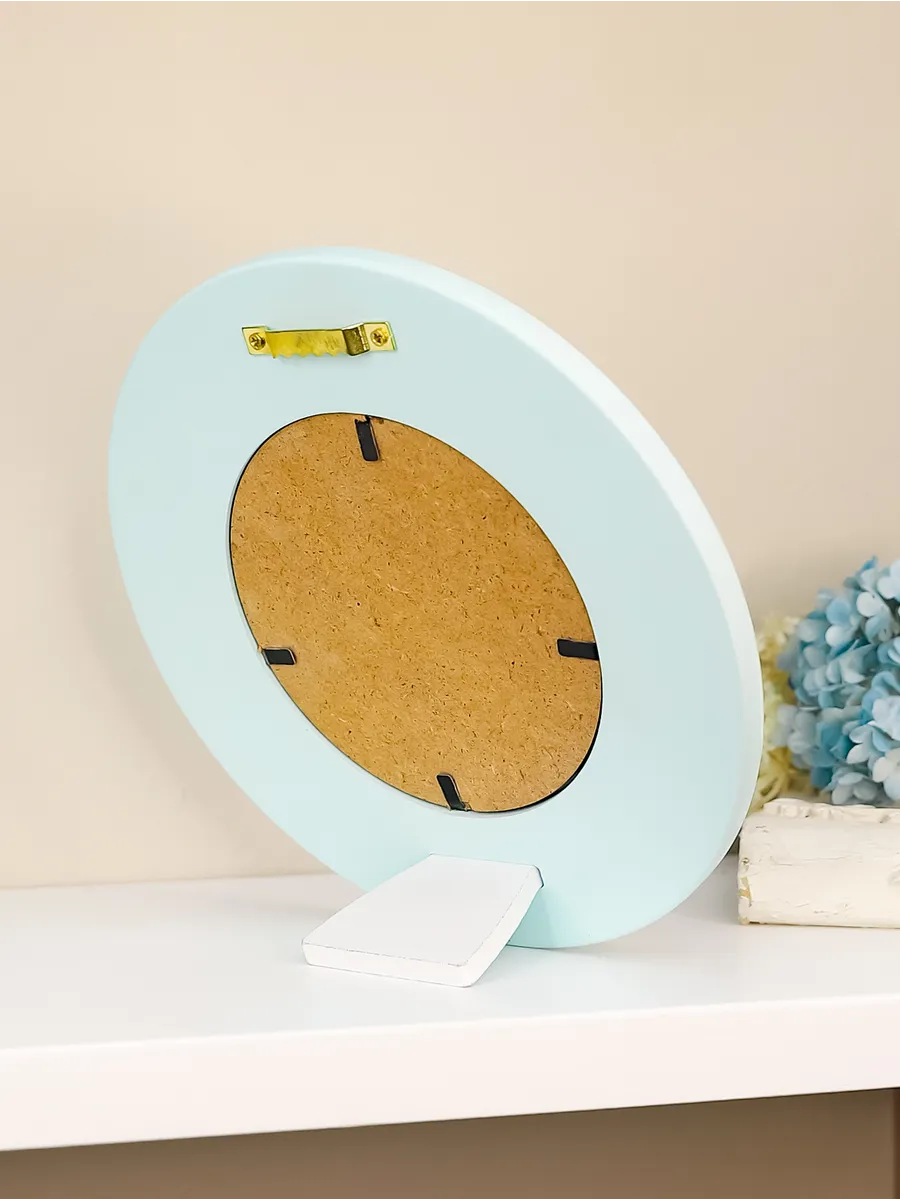Рама изготовлена из цельного листа МДФ 16 мм, не имеет зазоров и стыков. Окрашена экологичной акриловой эмалью в бирюзовый цвет. Диаметр картины 17 см, диаметр изображения 9 см. Крепление для стены и установки на стол в комплекте.