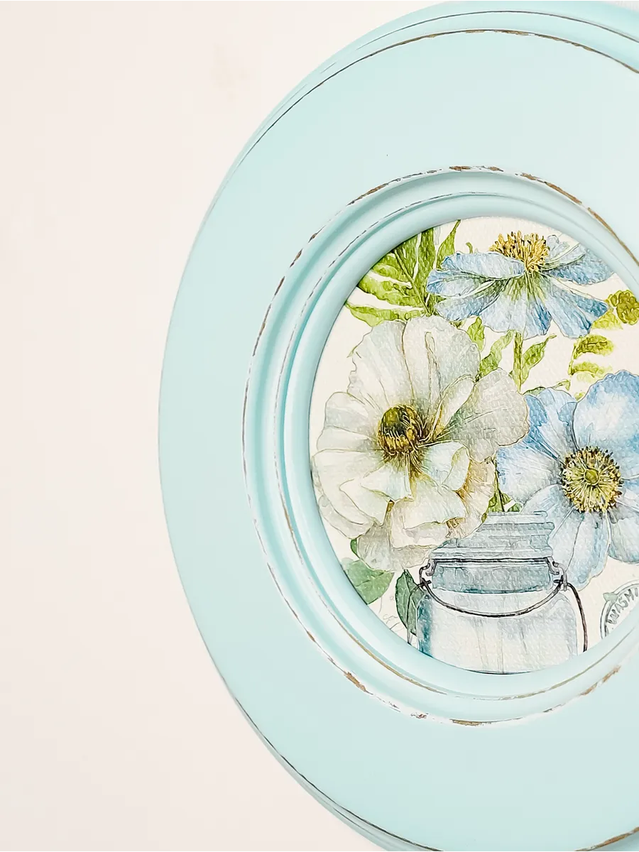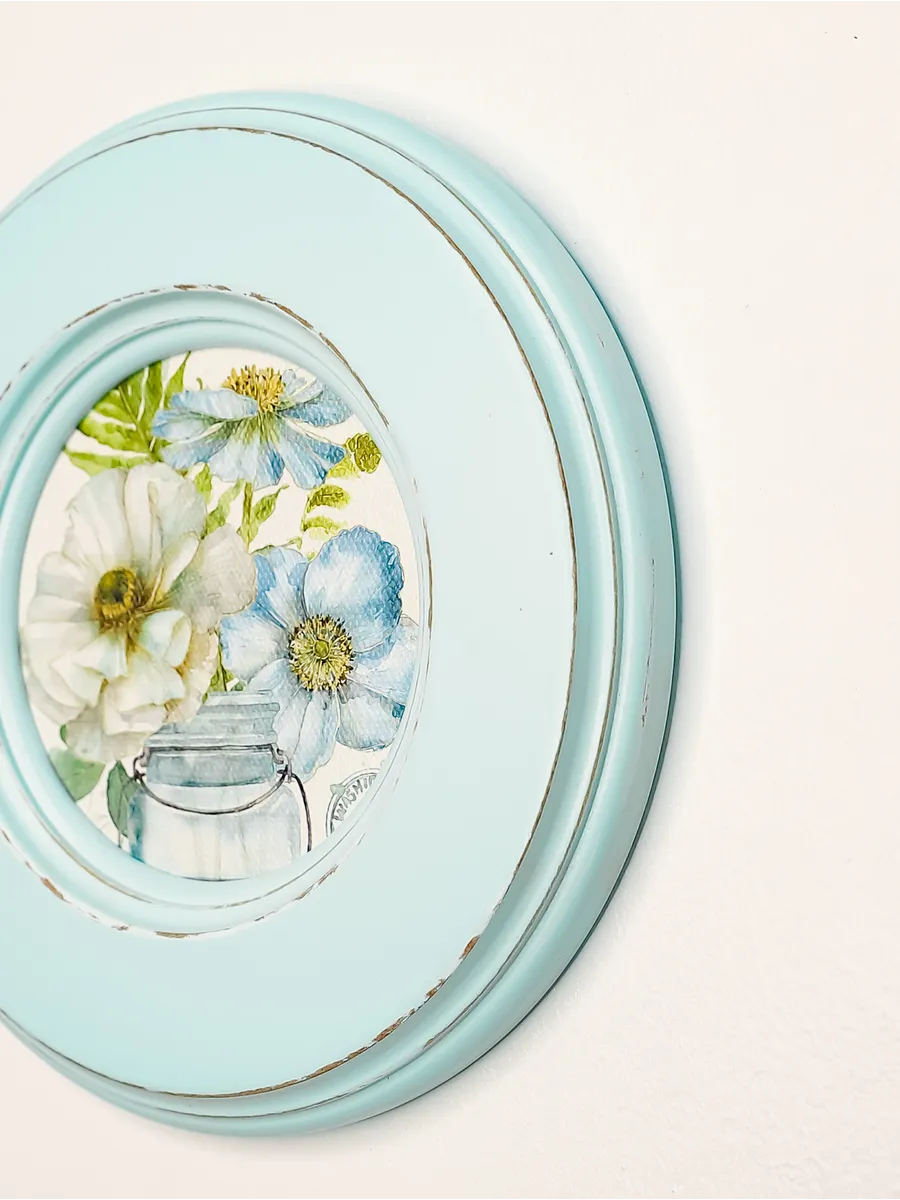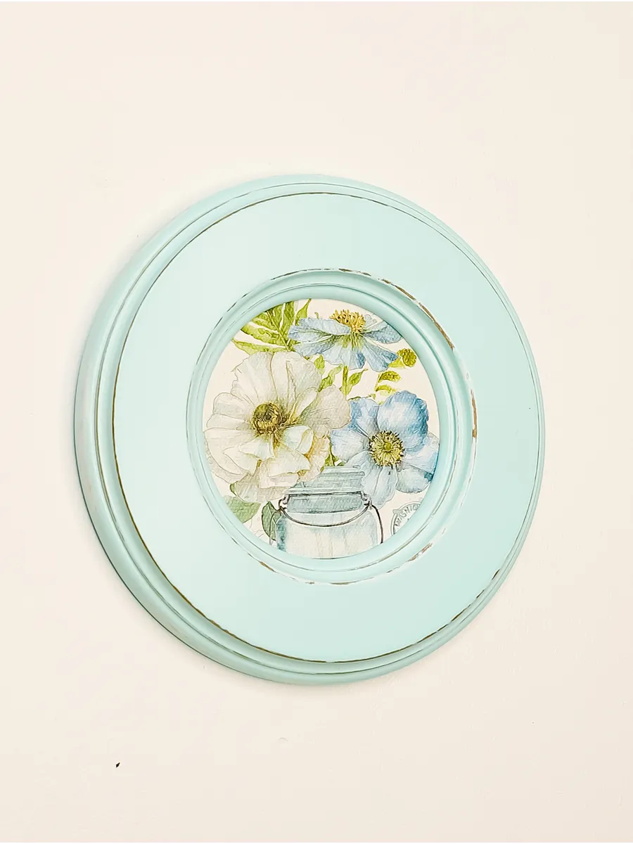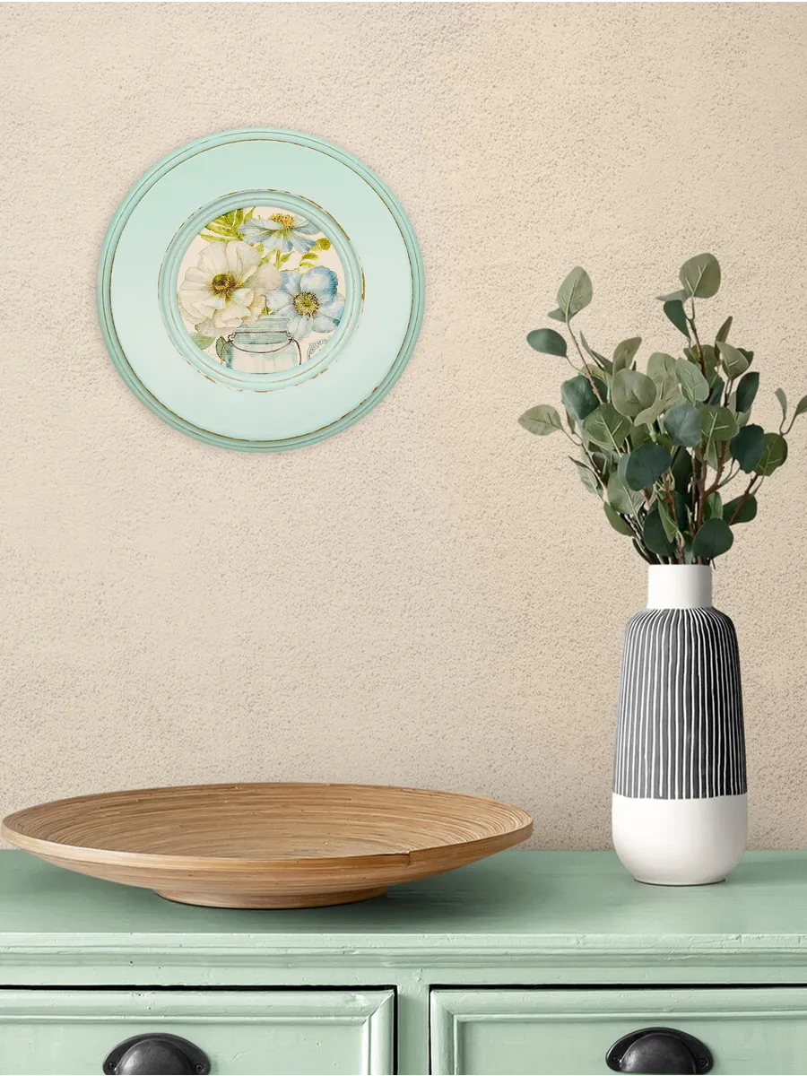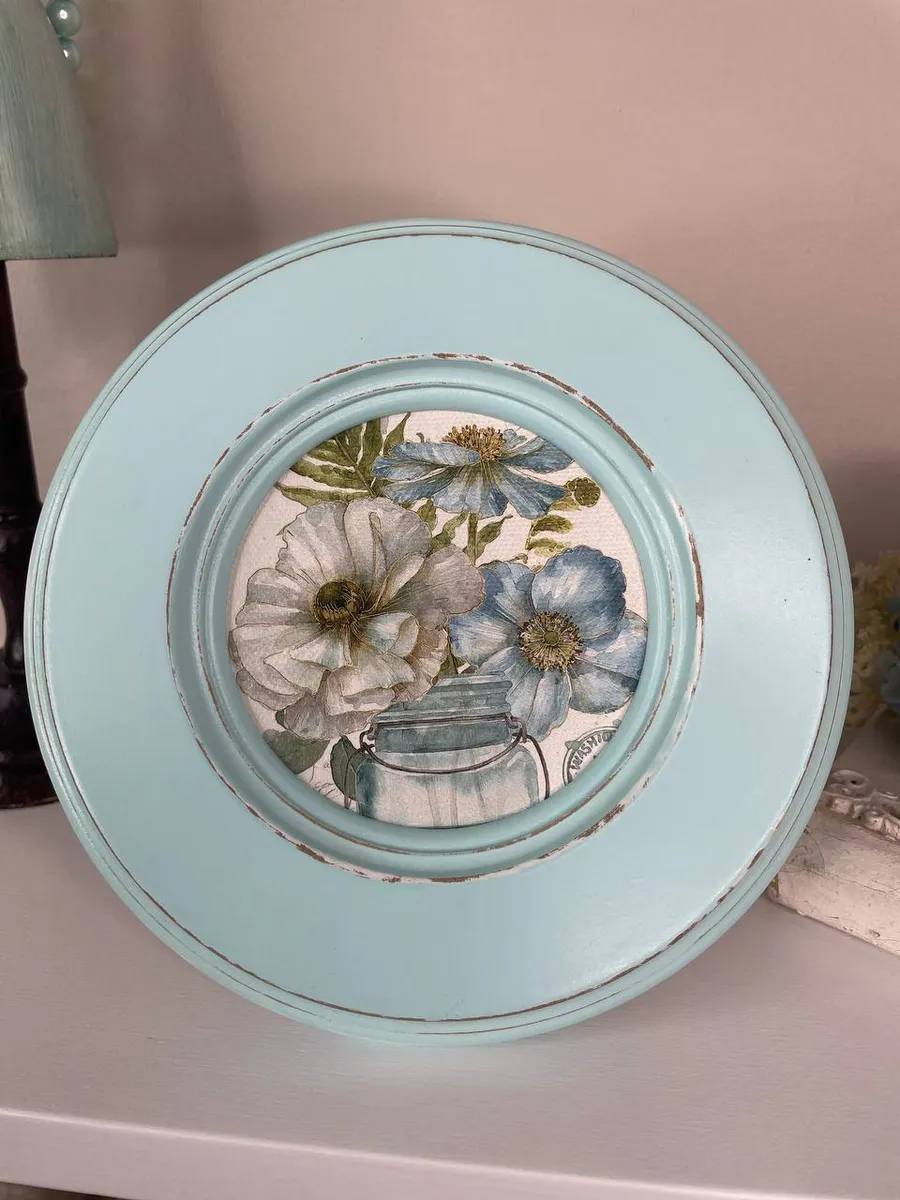 Рама изготовлена из цельного листа МДФ 16 мм, не имеет зазоров и стыков. Окрашена экологичной акриловой эмалью в бирюзовый цвет. Диаметр картины 17 см, диаметр изображения 9 см. Крепление для стены и установки на стол в комплекте.