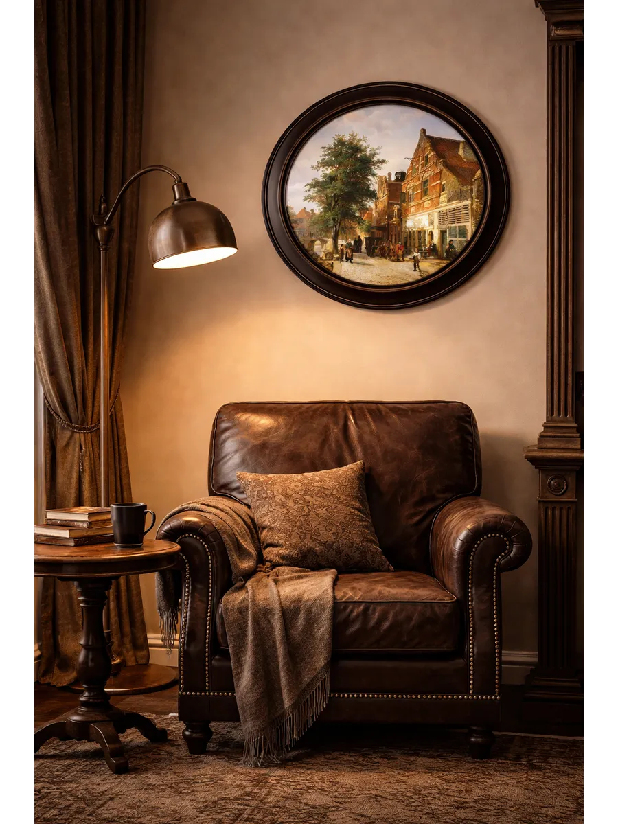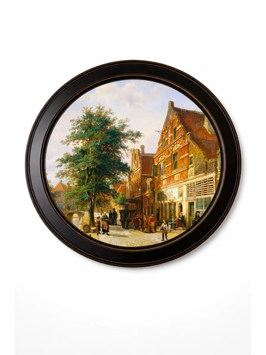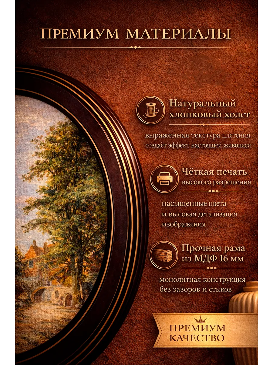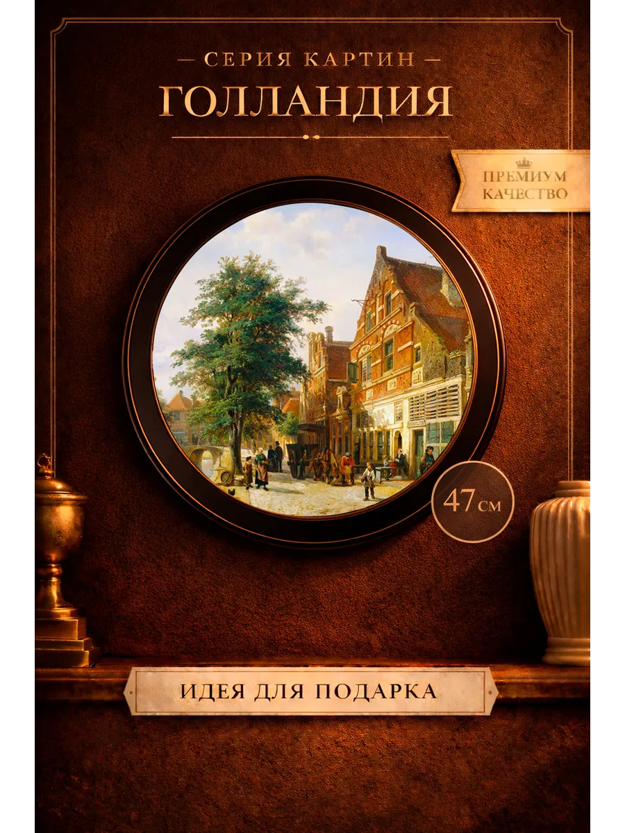 Картина на натуральном холсте из серии «Голландия» — это стильный интерьерный декор, который добавит дому атмосферу европейской классики и уюта. Сюжеты вдохновлены старинными улочками Голландии, архитектурой европейских городов и спокойной атмосферой тихих городских пейзажей. Такая круглая картина на стену станет эффектным акцентом в интерьере гостиной, спальни, кабинета, кухни или прихожей.