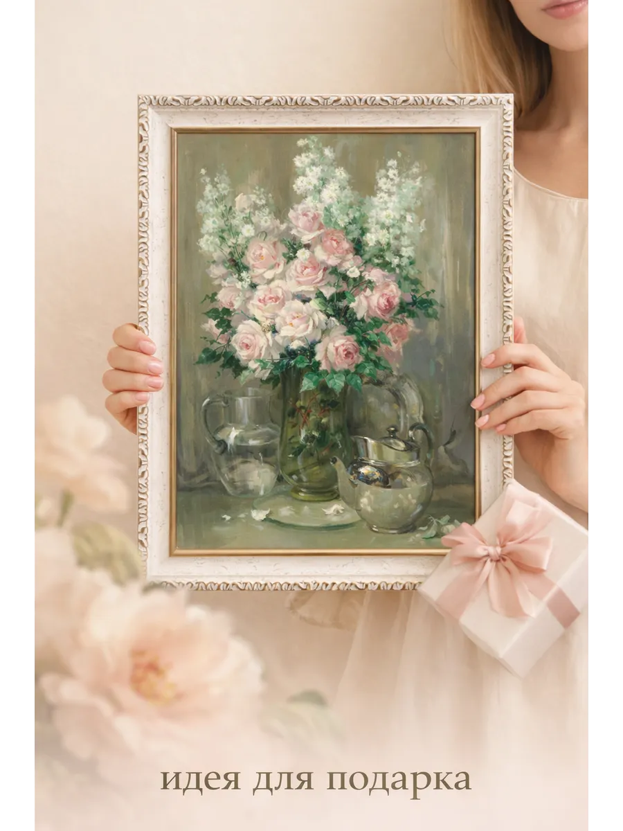Картина в раме с нежным винтажным букетом. Натуральный холст, мягкие пастельные оттенки, размер 37×47 см — идеальна для уютного интерьера и подарка.