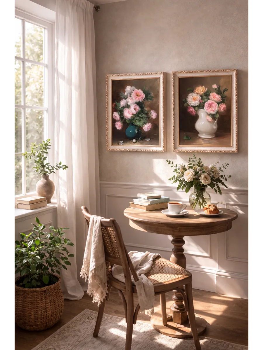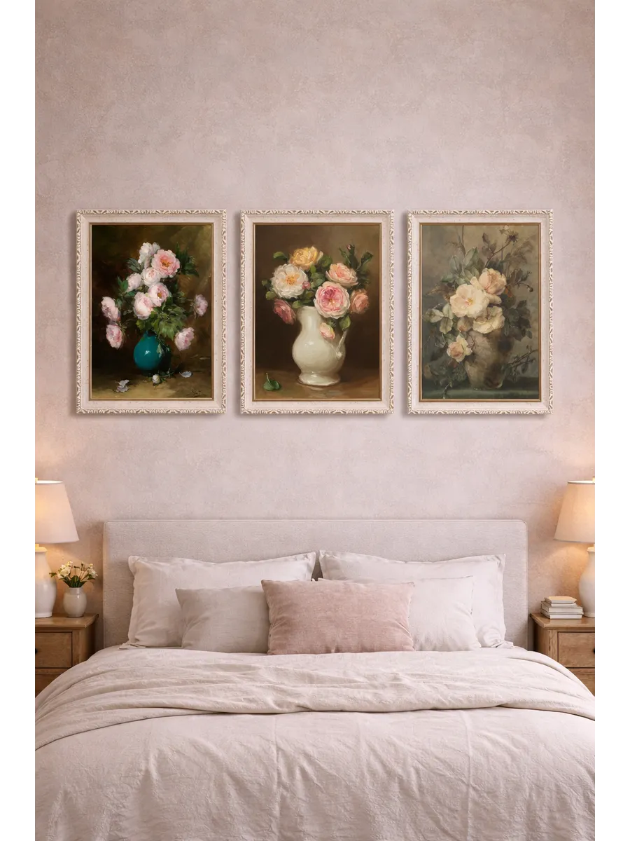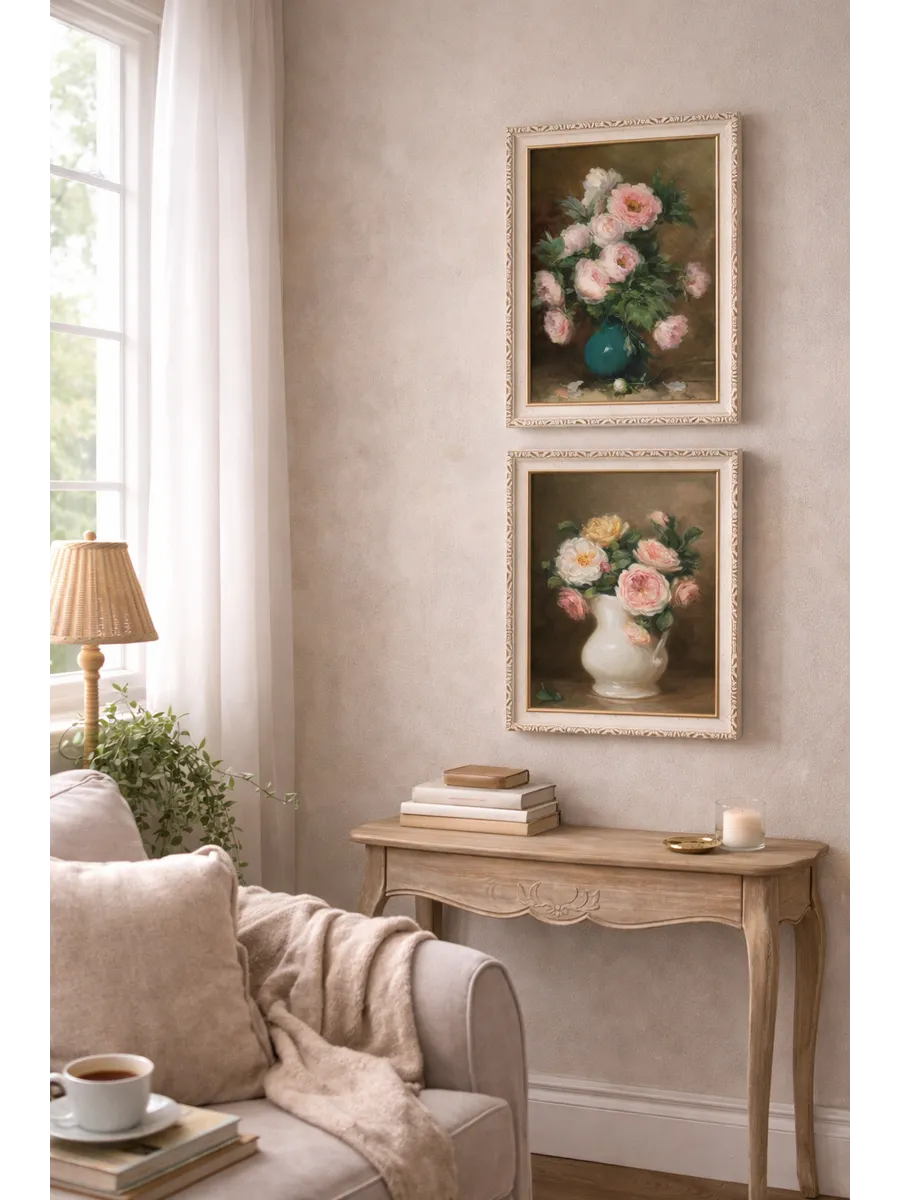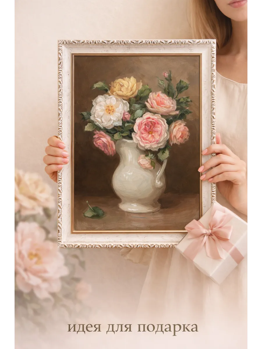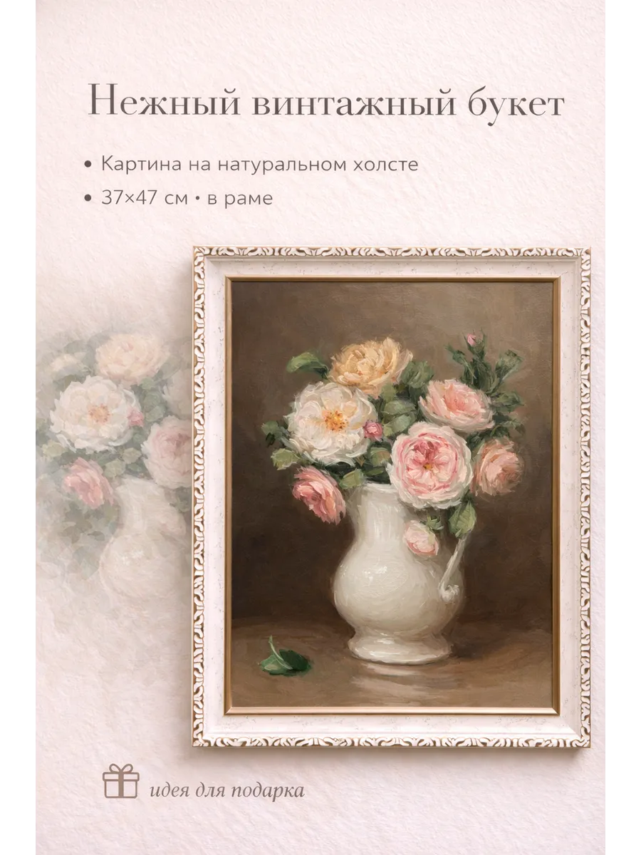 Картина в раме с нежным винтажным букетом. Натуральный холст, мягкие пастельные оттенки, размер 37×47 см — идеальна для уютного интерьера и подарка.