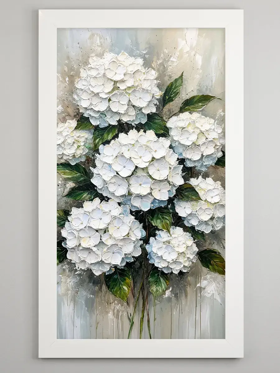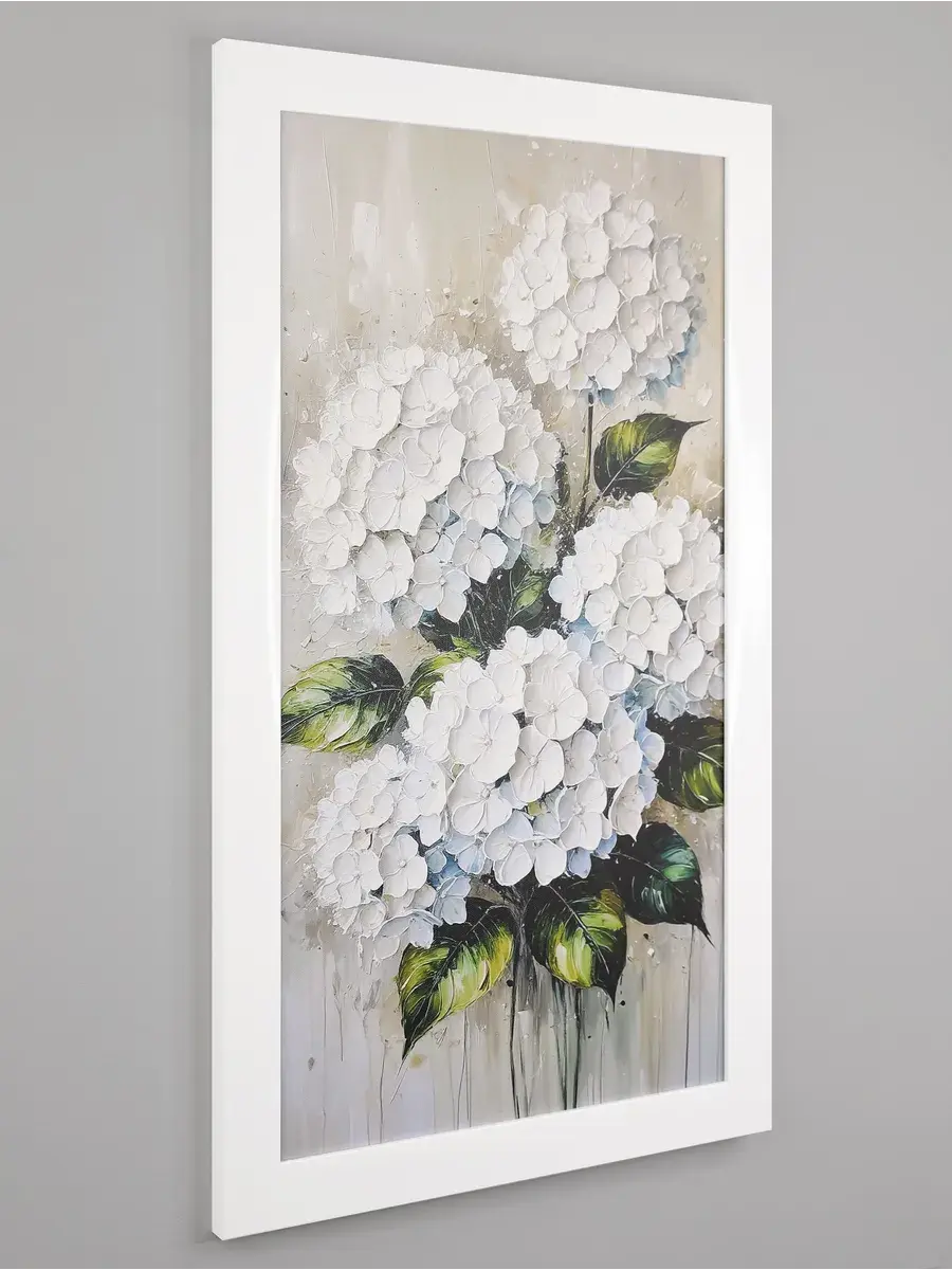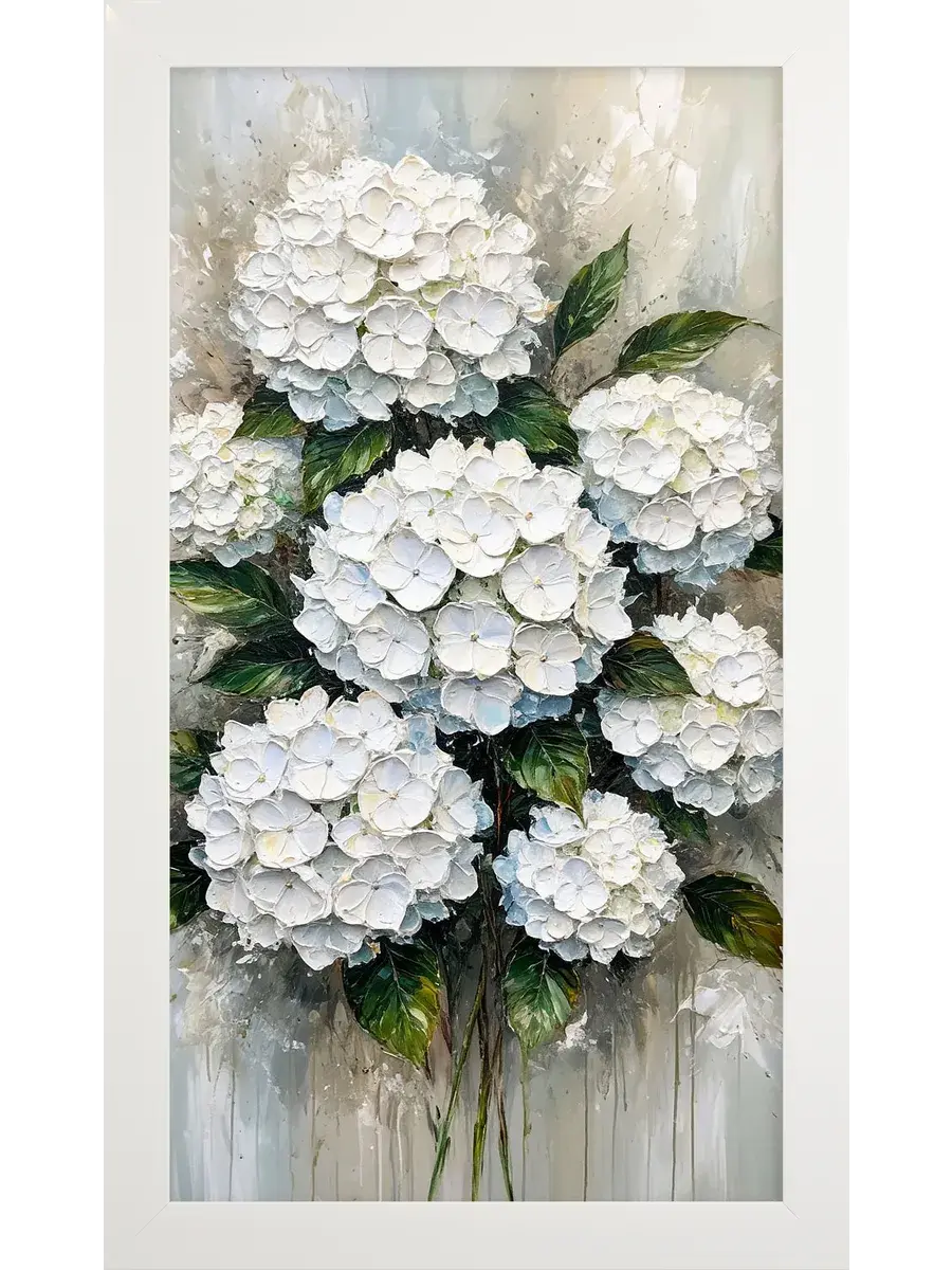 Картина "Букет белой гортензии" от Elenadecor станет прекрасным дополнением к любому интерьеру, наполняя его атмосферой нежности, уюта и гармонии. Этот шедевр, выполненный на хлопковом холсте и обрамленный в стильную лаконичную белоснежную раму, станет настоящим украшением вашей гостиной, спальни или рабочего кабинета. Размер картины 66*39 см позволяет ей стать центральным элементом декора, привнося в пространство свет и ощущение покоя. Изображение пышного букета белой гортензии на фоне темно-зеленых листьев с серо-голубыми и белыми оттенками создает ощущение релакса и отдыха, помогая снять напряжение после долгого дня. Картина станет прекрасным подарком для мамы, бабушки или сестры на день рождения, день матери или новоселье, наполнив их дом теплом и уютом.