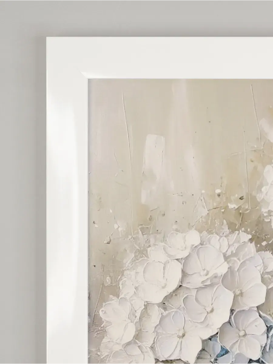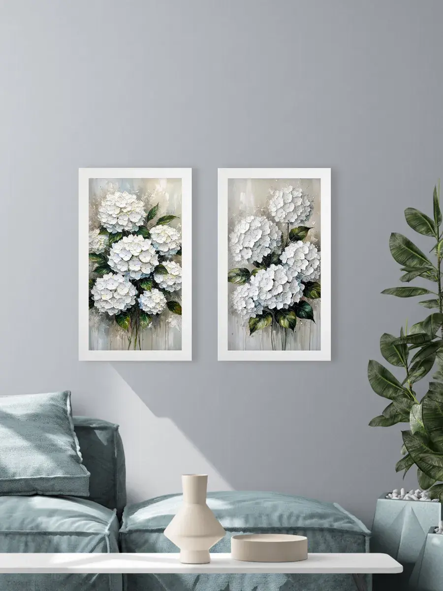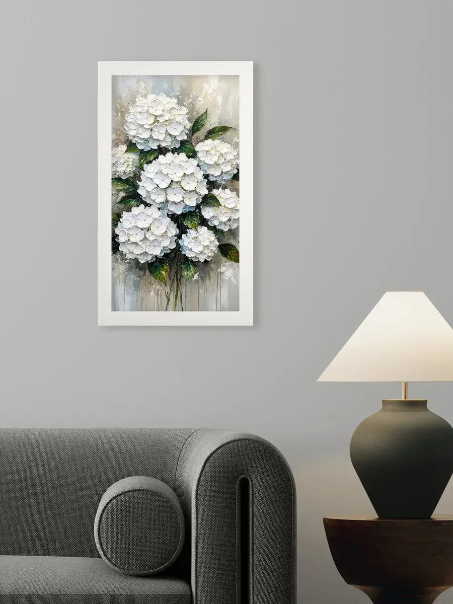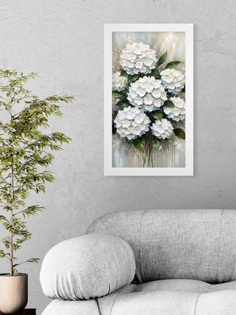 Картина "Букет белой гортензии" от Elenadecor станет прекрасным дополнением к любому интерьеру, наполняя его атмосферой нежности, уюта и гармонии. Этот шедевр, выполненный на хлопковом холсте и обрамленный в стильную лаконичную белоснежную раму, станет настоящим украшением вашей гостиной, спальни или рабочего кабинета. Размер картины 66*39 см позволяет ей стать центральным элементом декора, привнося в пространство свет и ощущение покоя. Изображение пышного букета белой гортензии на фоне темно-зеленых листьев с серо-голубыми и белыми оттенками создает ощущение релакса и отдыха, помогая снять напряжение после долгого дня. Картина станет прекрасным подарком для мамы, бабушки или сестры на день рождения, день матери или новоселье, наполнив их дом теплом и уютом.