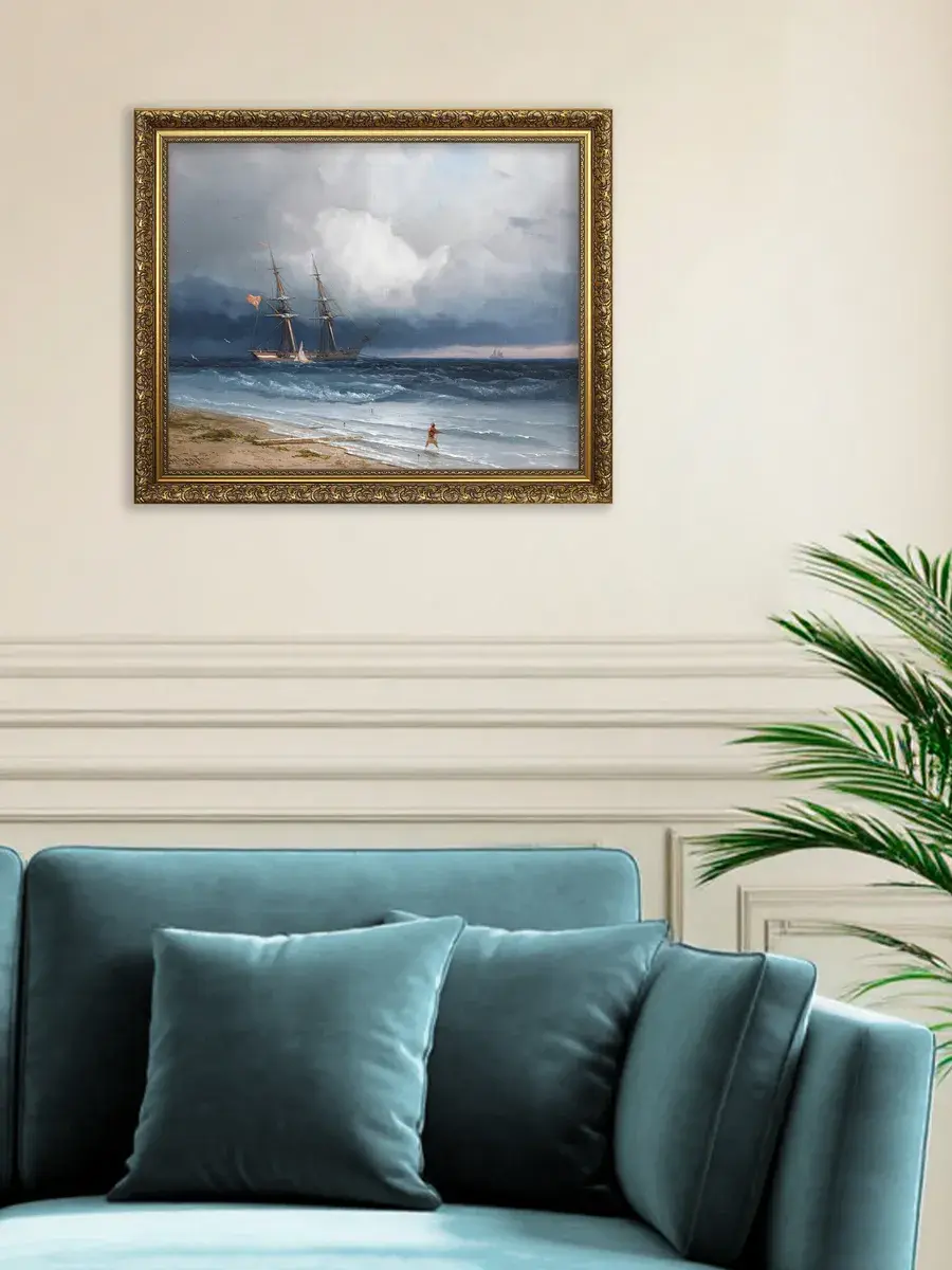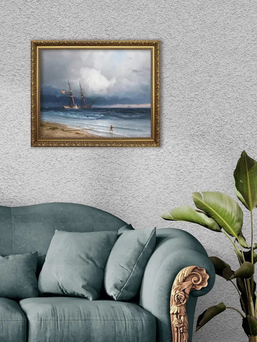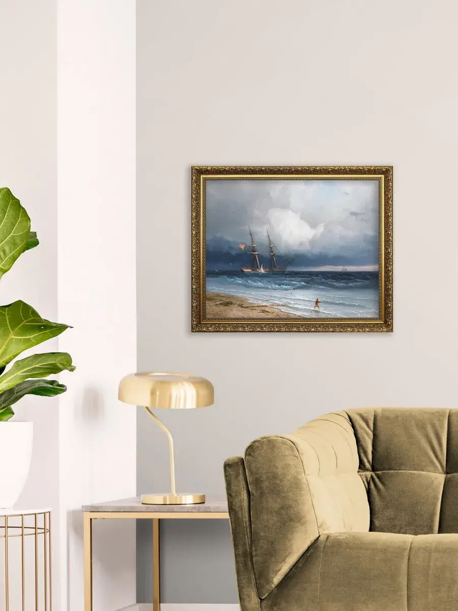Репродукция картины Ивана Айвазовского "Корабль на берегу" от Elenadecor – это прекрасный способ привнести в ваш дом атмосферу умиротворения. Эта интерьерная репродукция, выполненная с помощью цифровой печати на хлопковом холсте, порадует вас высоким качеством исполнения и яркими, насыщенными цветами. Картина обрамлена в красивый классический багет, что придает ей завершенный вид и позволяет сразу же повесить ее на стену. Это произведение станет прекрасным дополнением к вашей коллекции мировых произведений и подарит вам возможность каждый день любоваться работой великого художника. Картина станет прекрасным подарком для любителей искусства, а также для тех, кто ценит красоту и гармонию в своем доме. Размер картины в раме 47х57 см, размер холста 40х50 см