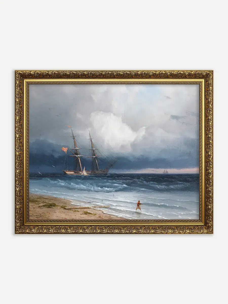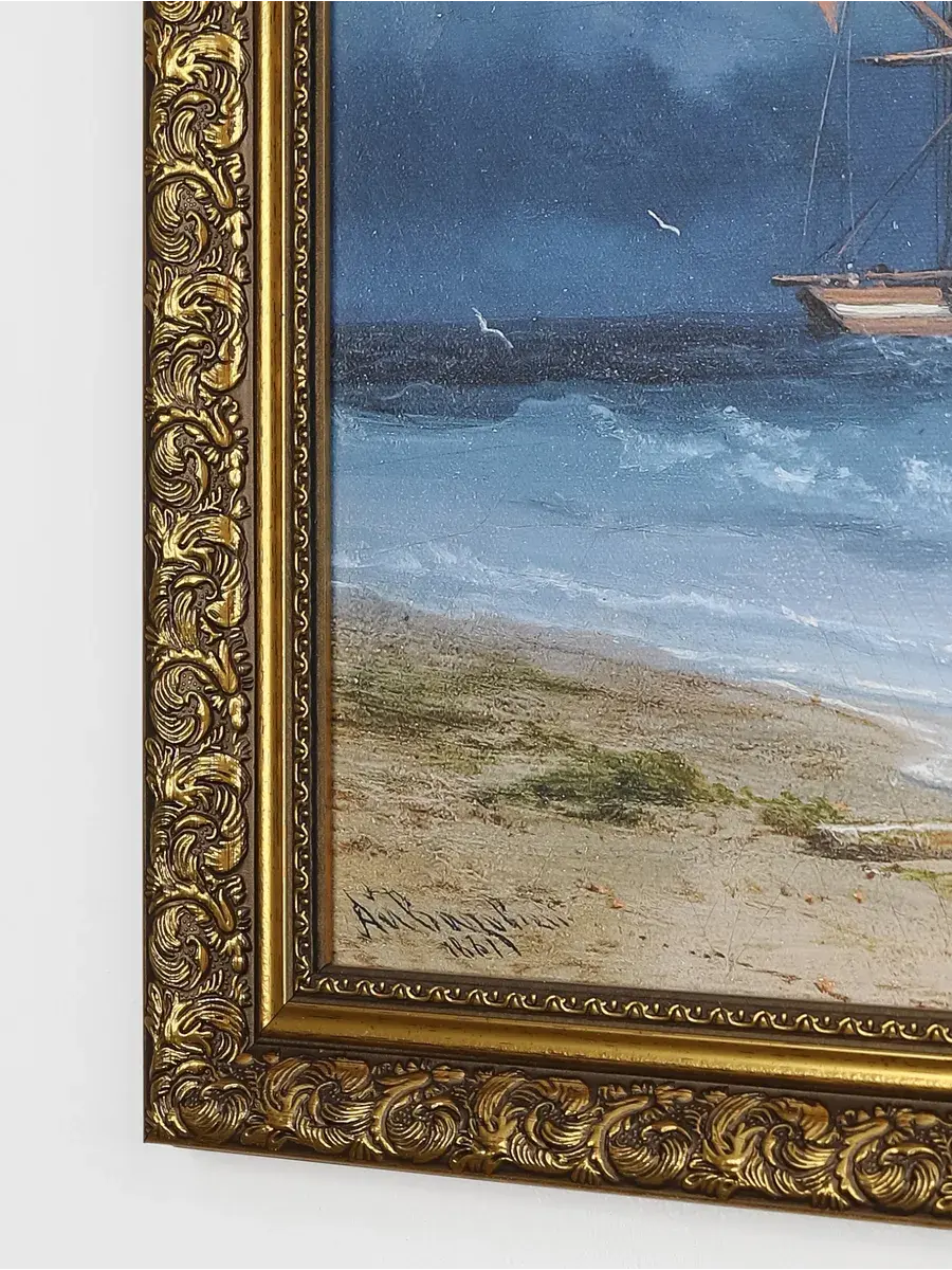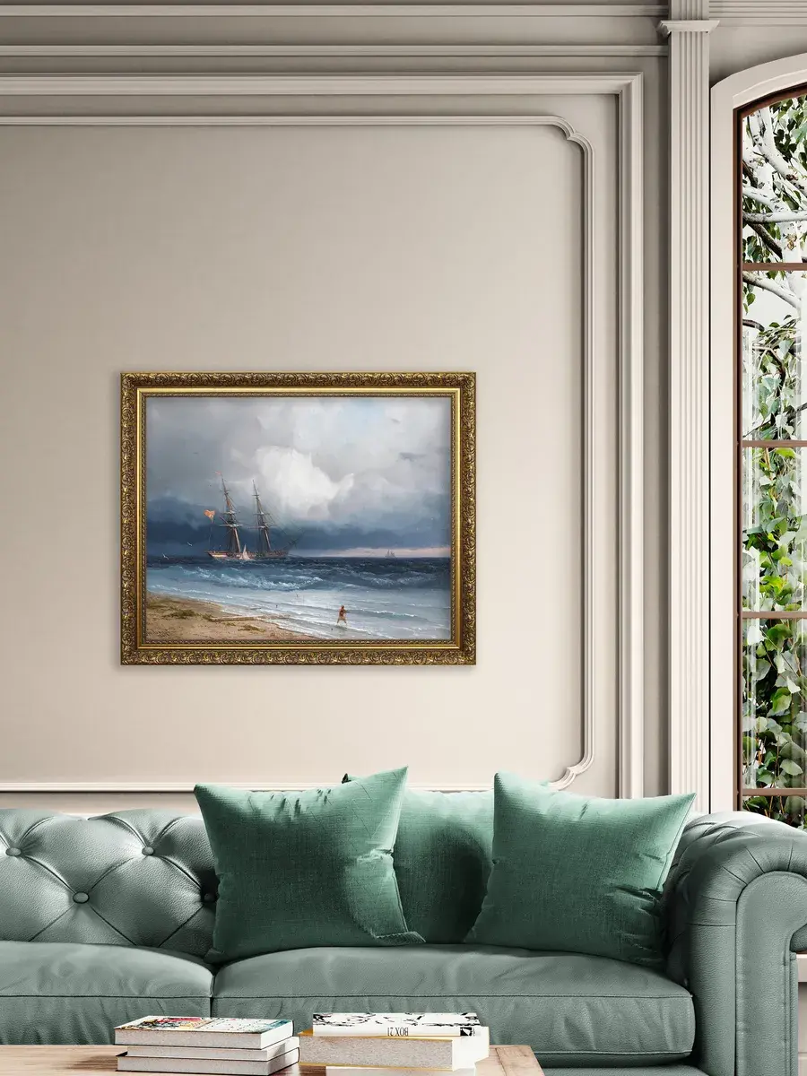 Репродукция картины Ивана Айвазовского "Корабль на берегу" от Elenadecor – это прекрасный способ привнести в ваш дом атмосферу умиротворения. Эта интерьерная репродукция, выполненная с помощью цифровой печати на хлопковом холсте, порадует вас высоким качеством исполнения и яркими, насыщенными цветами. Картина обрамлена в красивый классический багет, что придает ей завершенный вид и позволяет сразу же повесить ее на стену. Это произведение станет прекрасным дополнением к вашей коллекции мировых произведений и подарит вам возможность каждый день любоваться работой великого художника. Картина станет прекрасным подарком для любителей искусства, а также для тех, кто ценит красоту и гармонию в своем доме. Размер картины в раме 47х57 см, размер холста 40х50 см