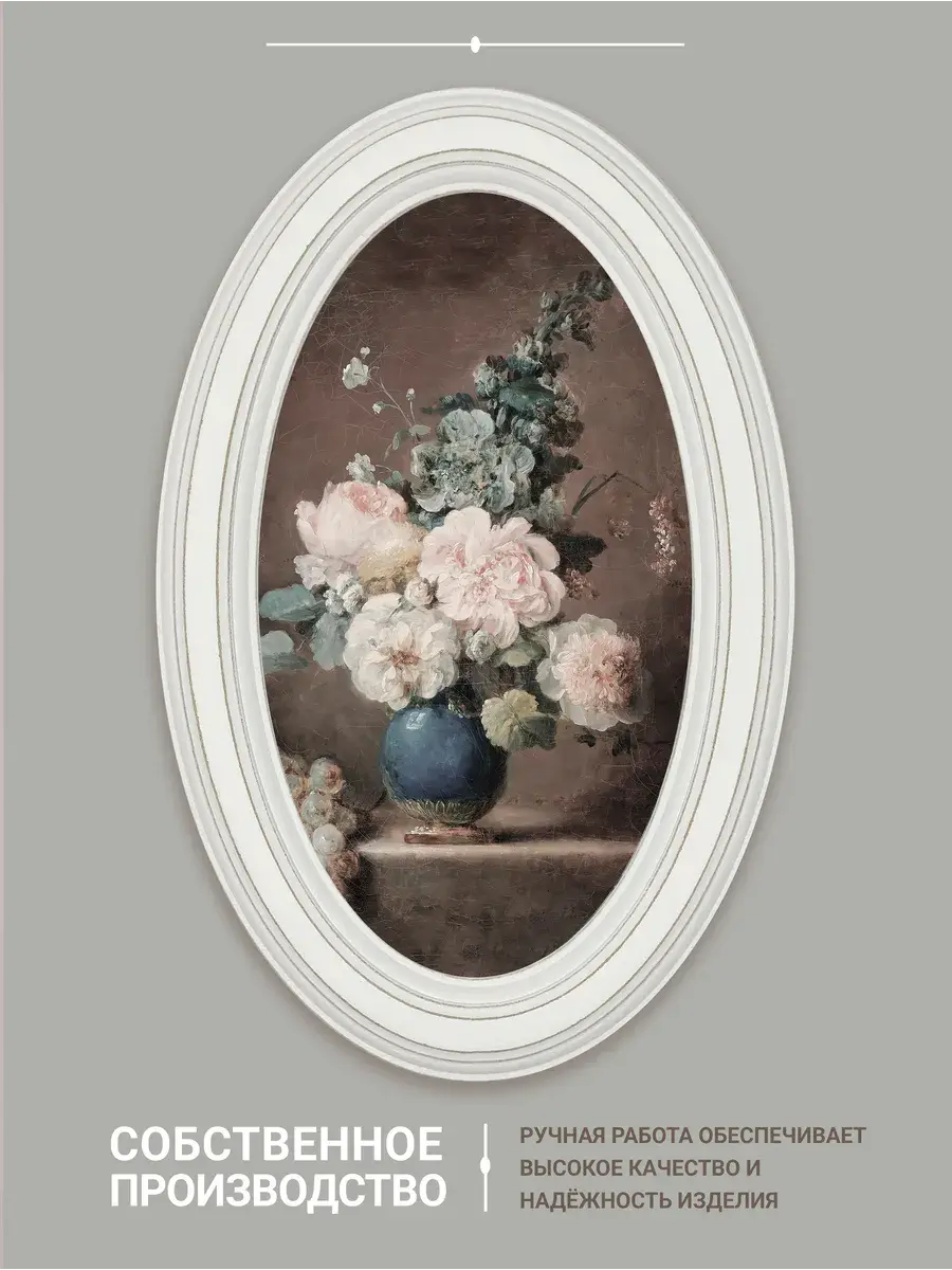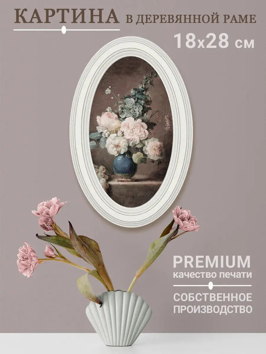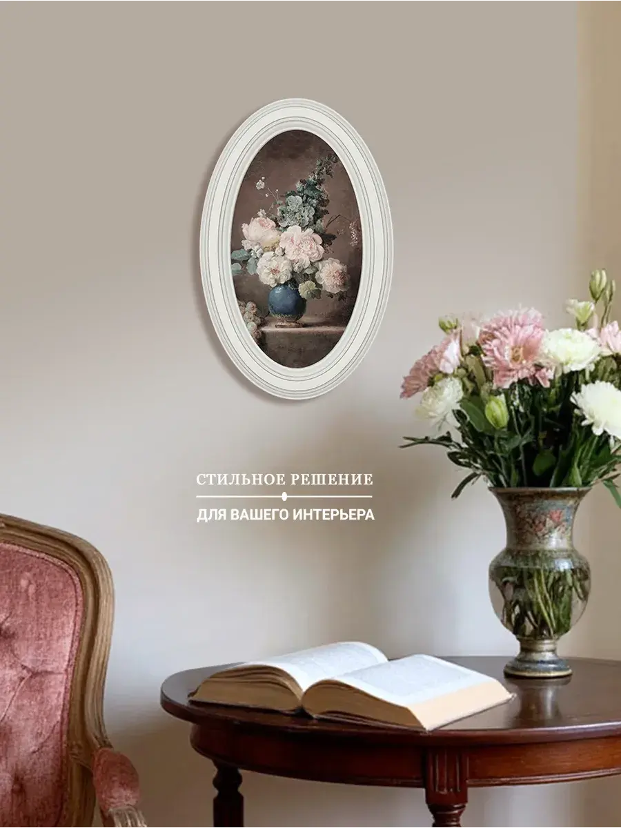 Настенный декор в нежных пастельный тонах. Картина напечатана на натуральном холсте, покрыта матовым лаком, оформлена в овальную белую раму с эффектом состаривания.