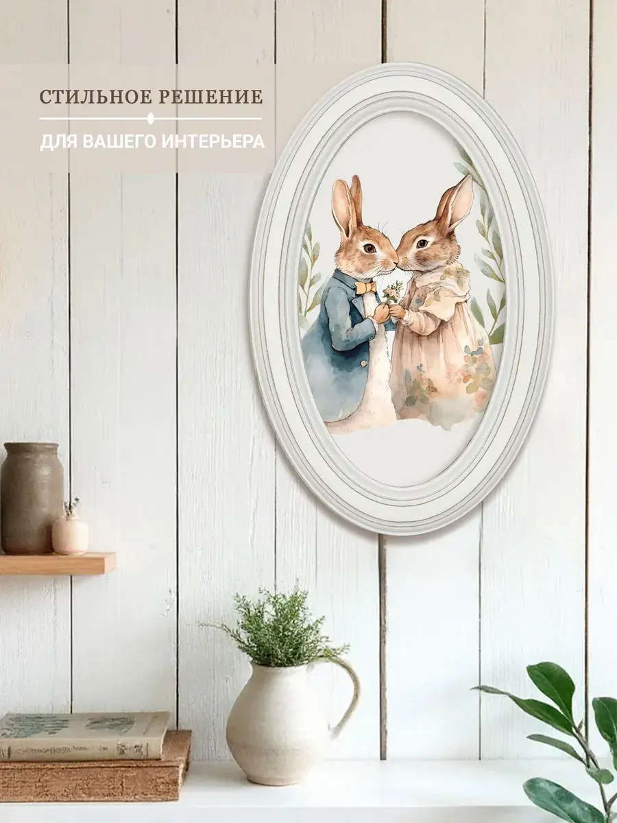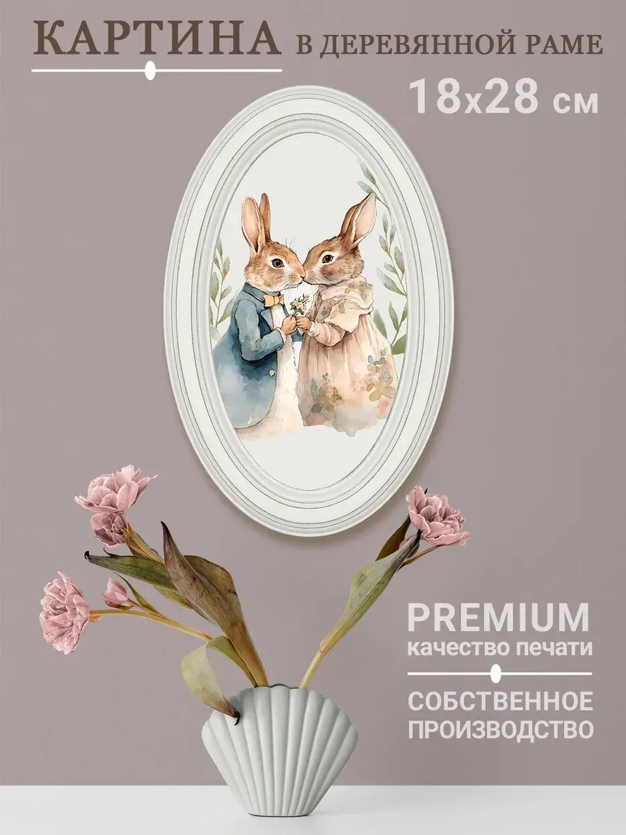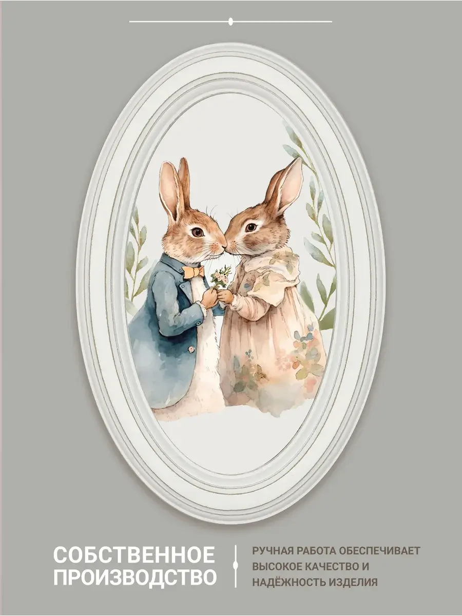 Настенный декор в нежных пастельный тонах. Картина напечатана на натуральном холсте, покрыта матовым лаком, оформлена в овальную белую раму с эффектом состаривания.