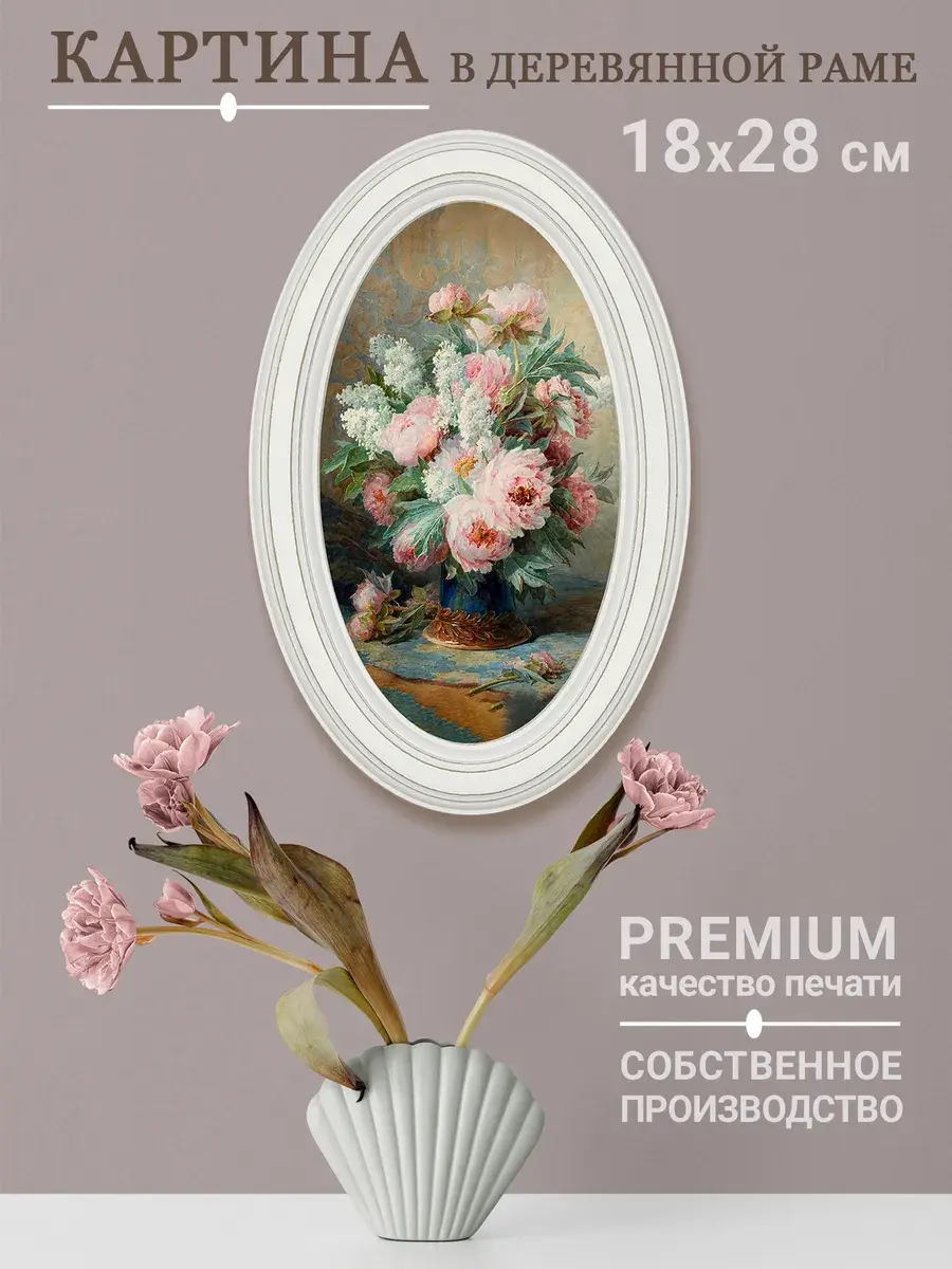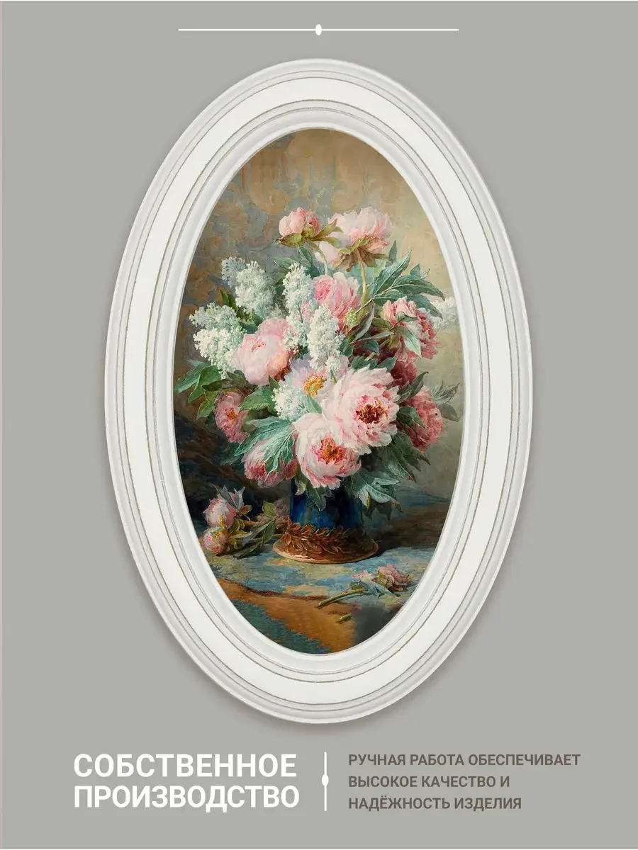 Настенный декор в нежных пастельный тонах. Картина напечатана на натуральном холсте, покрыта матовым лаком, оформлена в овальную белую раму с эффектом состаривания.