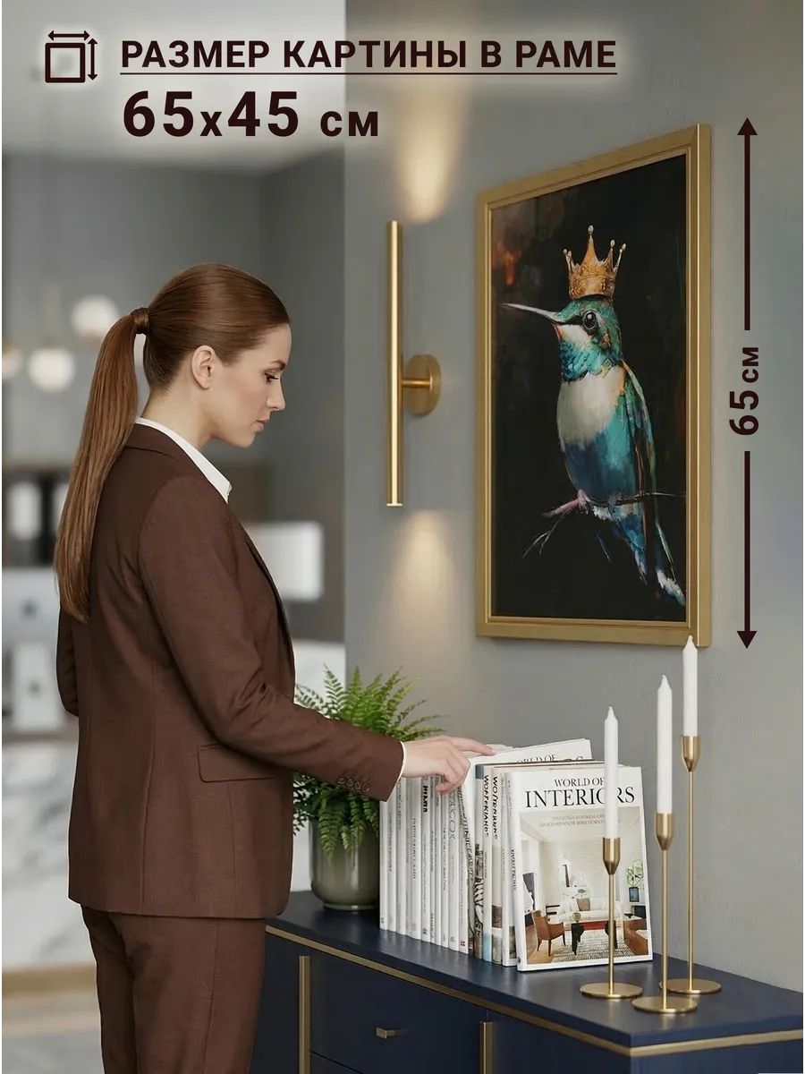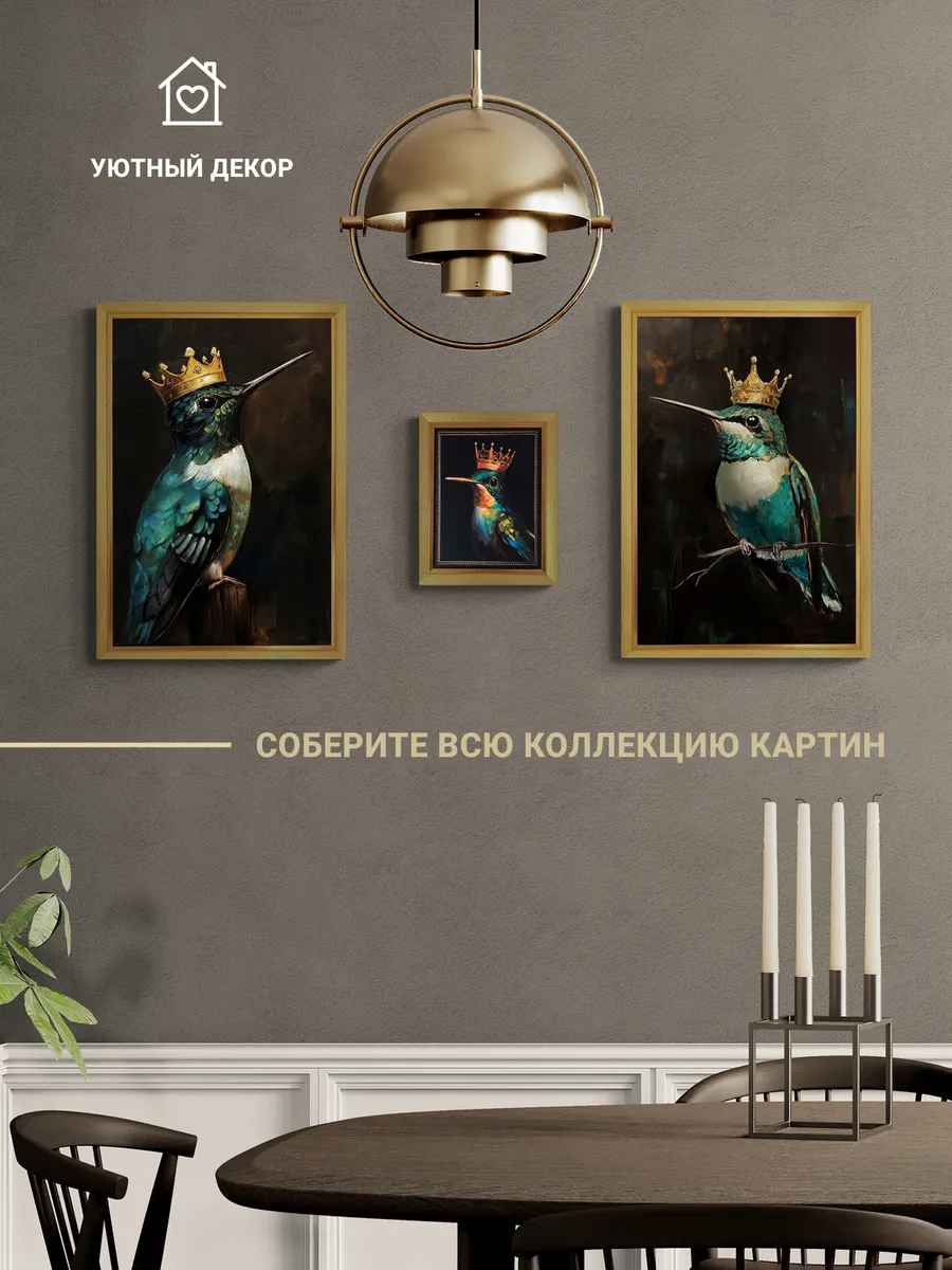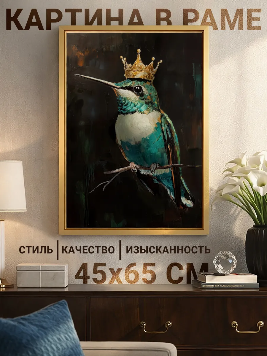 Эффектная интерьерная картина с яркой колибри в короне станет настоящим украшением вашего дома. Глубокий темный фон, выразительная фактура мазков и элегантная золотая рама создают ощущение дорогого художественного декора и сразу притягивают взгляд.