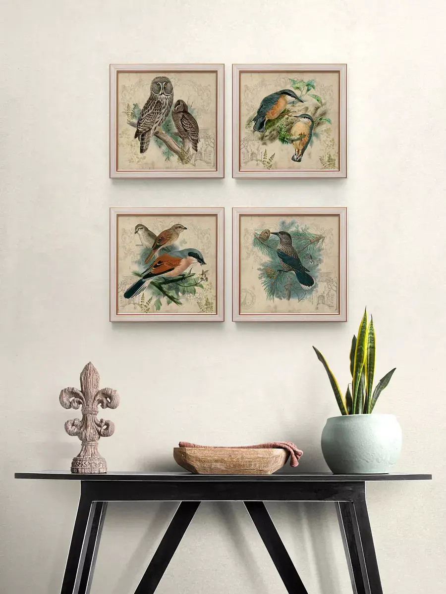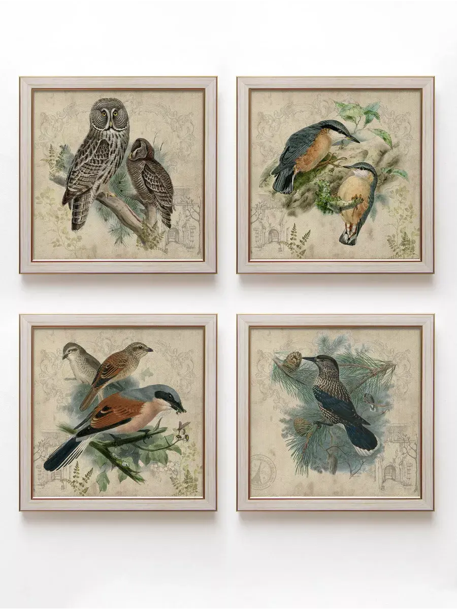 Внимание! Цвет багета изменился. Набор из четырех картин на натуральном холсте. Размер каждой картины 22.5*22.5 см. Настенный декор в раме, это современный способ украсить стены вашего дома и расслабить Вас после работы, атмосфера релакса, уюта и тепла. Картины для кухни в современном стиле с птицами. Картина напечатана в высоком разрешении на натуральном холсте, покрыта матовым лаком, размер холста 19х19 см, размер с рамой 22.5х22.5 см. В комплекте шуруп с дюбелем и зубчатый крепеж на раме. Рама из полиуретана спокойного молочного цвета. Картины предназначены для создания коллекций в гостиной, детской, прихожей, спальне или кухне. Украшение для дома и дачи, подарок в дом друзьям и коллегам. Картины упакованы в пакет и коробку.