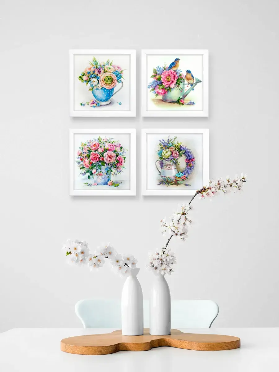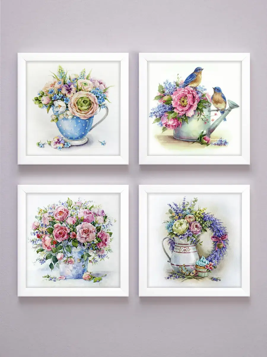 Набор из четырех картин на натуральном холсте. Размер каждой картины 22х22 см. Настенный декор в раме, это современный способ украсить стены вашего дома и расслабить Вас после работы, атмосфера релакса, уюта и тепла. Картина напечатана в высоком разрешении на натуральном холсте, покрыта матовым лаком, размер холста 19х19 см, размер с рамой 22х22 см. В комплекте шуруп с дюбелем и зубчатый крепеж на раме. Рама из полиуретана белого цвета. Картины предназначены для создания коллекций в гостиной, детской, прихожей, спальне или кухне. Украшение для дома и дачи, подарок в дом друзьям и коллегам. Картины упакованы в пакет и коробку.