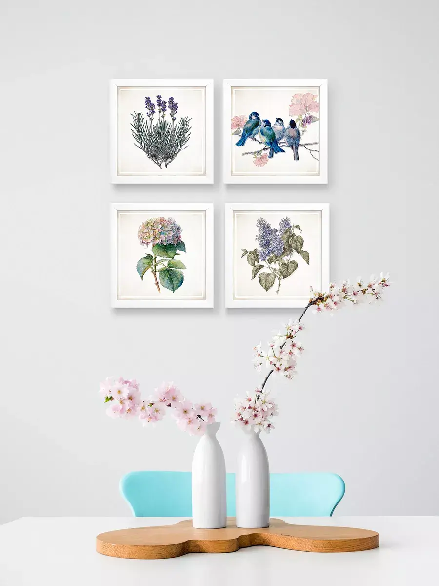 Набор из четырех картин на натуральном холсте. Размер каждой картины 22х22 см. Настенный декор в раме, это современный способ украсить стены вашего дома и расслабить Вас после работы, атмосфера релакса, уюта и тепла. Картина напечатана в высоком разрешении на натуральном холсте, покрыта матовым лаком, размер холста 19х19 см, размер с рамой 22х22 см. В комплекте шуруп с дюбелем и зубчатый крепеж на раме. Рама из полиуретана белого цвета. Картины предназначены для создания коллекций в гостиной, детской, прихожей, спальне или кухне. Украшение для дома и дачи, подарок в дом друзьям и коллегам. Картины упакованы в пакет и коробку.