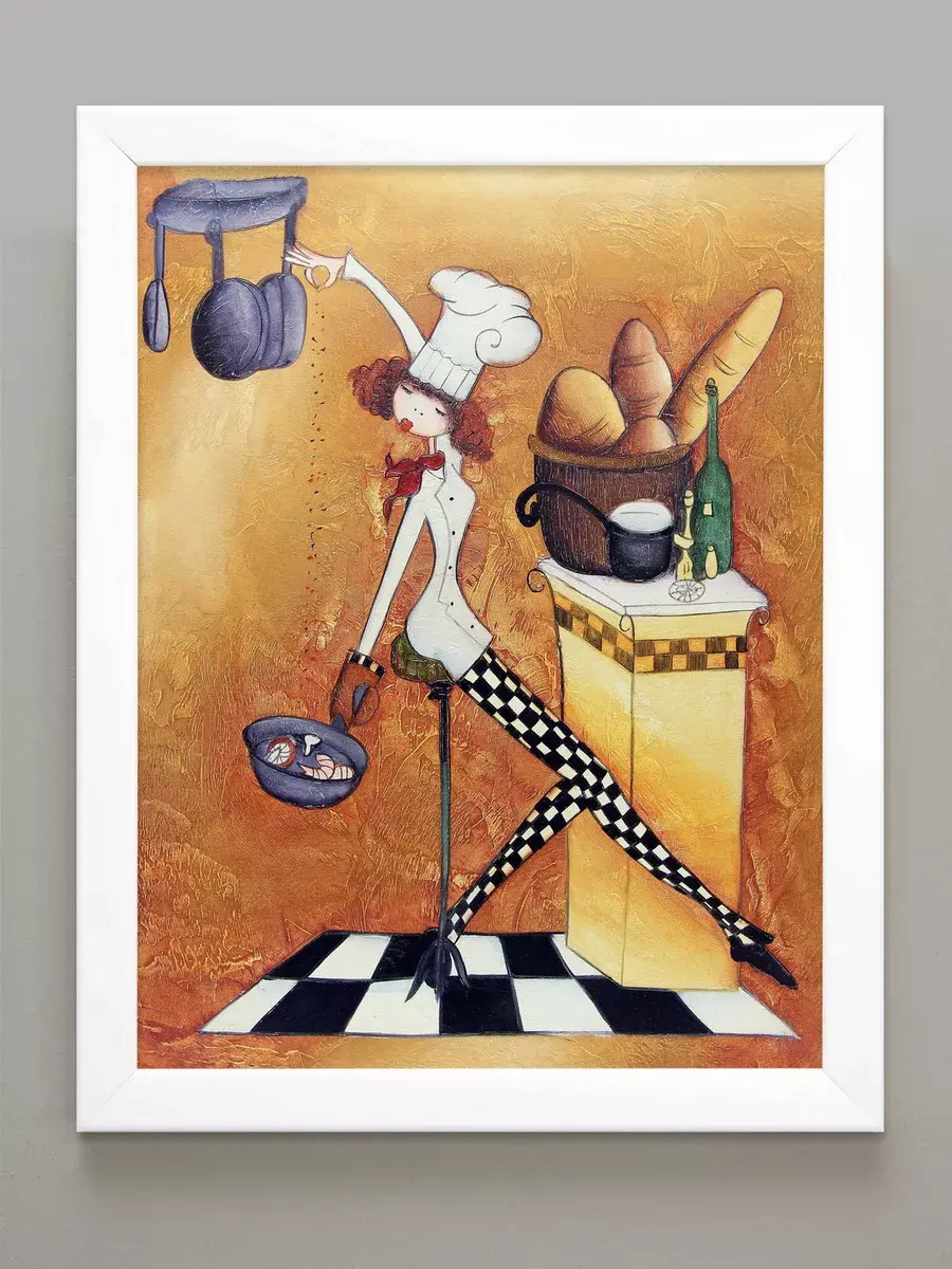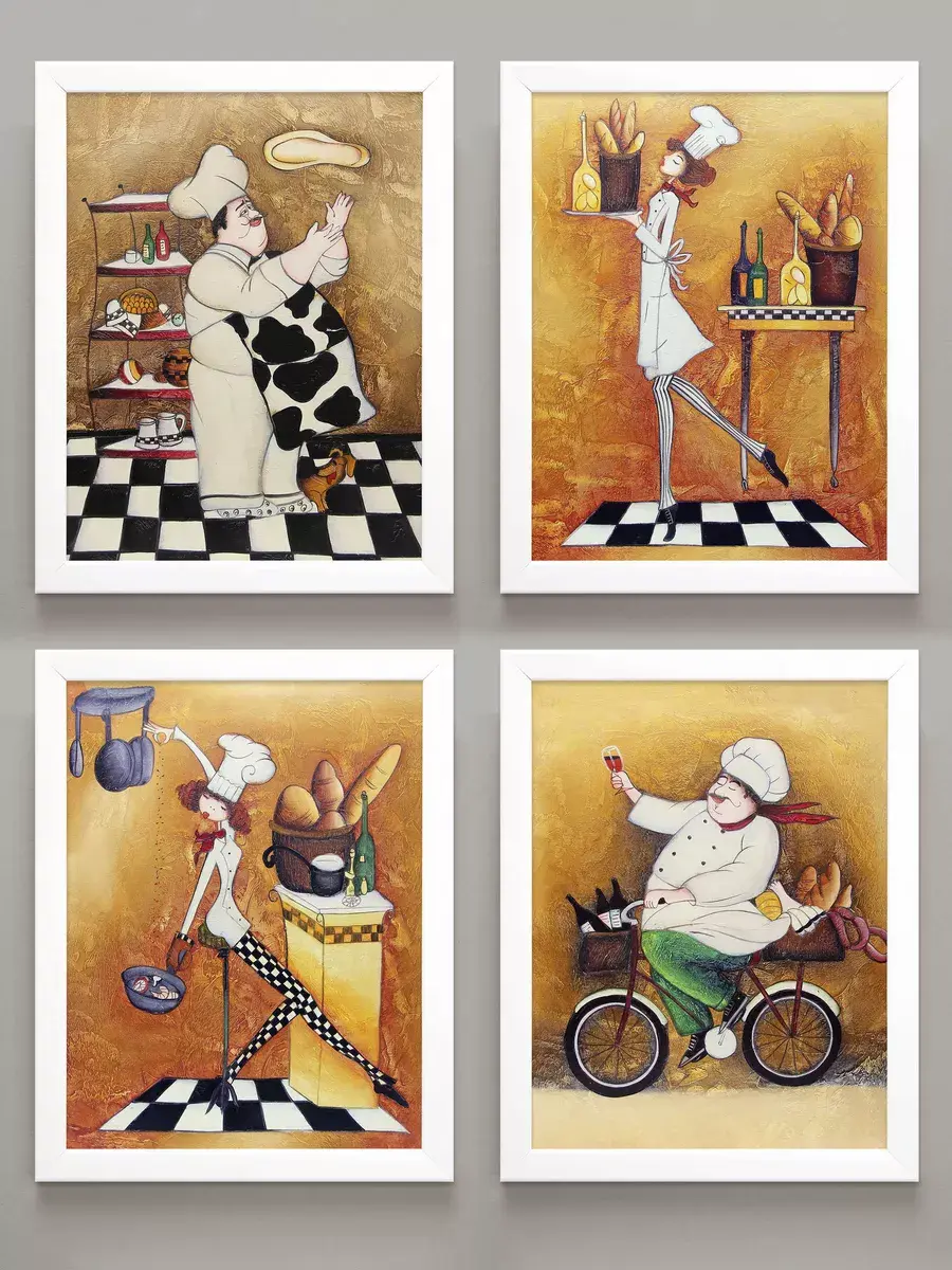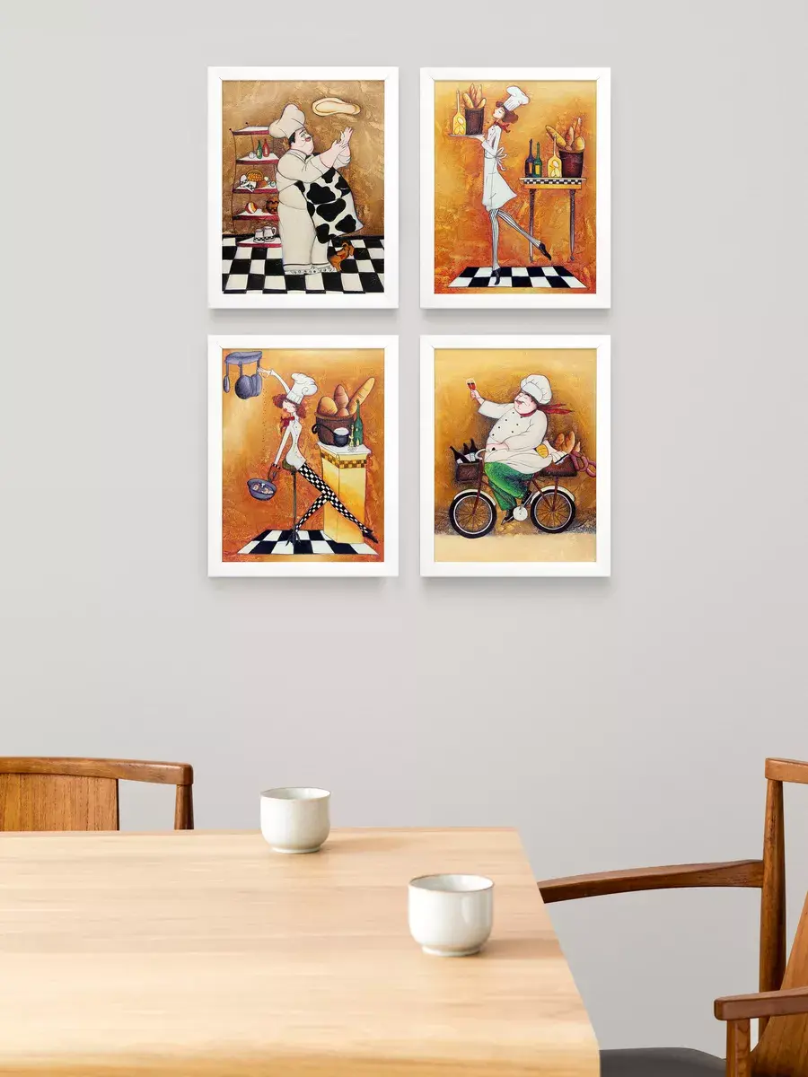 Набор из четырех картин на бумаге "Веселый повар". Размер каждой картины 20,5х26,5 см. Настенный декор в раме, это современный способ украсить стены вашего дома и расслабить Вас после работы, атмосфера релакса, уюта и тепла. Картина напечатана в высоком разрешении на высококачественной постерной бумаге и заламинирована, размер с рамой 20,5х26,5 см. В комплекте шуруп с дюбелем и зубчатый крепеж на раме. Рама из полиуретана белого цвета. Картины предназначены для создания коллекций в гостиной, детской, прихожей, спальне или кухне. Украшение для дома и дачи, подарок в дом друзьям и коллегам. Картины упакованы в пакет и коробку.