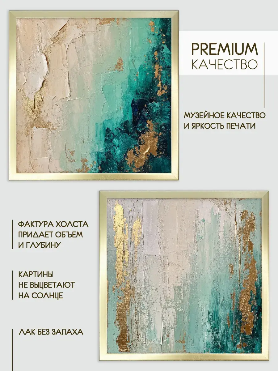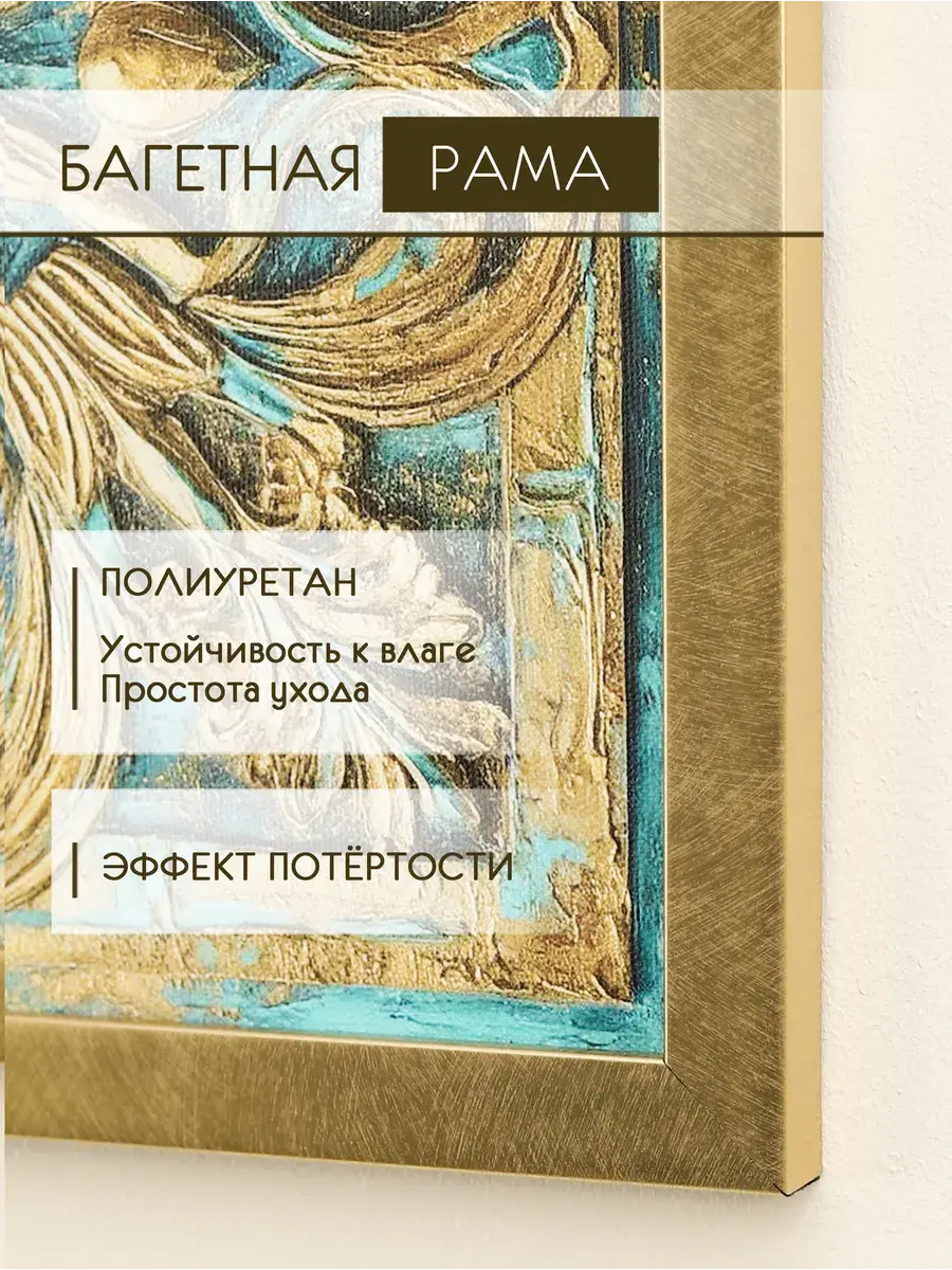 Картина напечатана на натуральном холсте, подрисовка золотой патиной, картины покрыты лаком. Основа для холста из ХДФ, что исключает провисание холста. Размер каждой картины с рамой 33*33 см