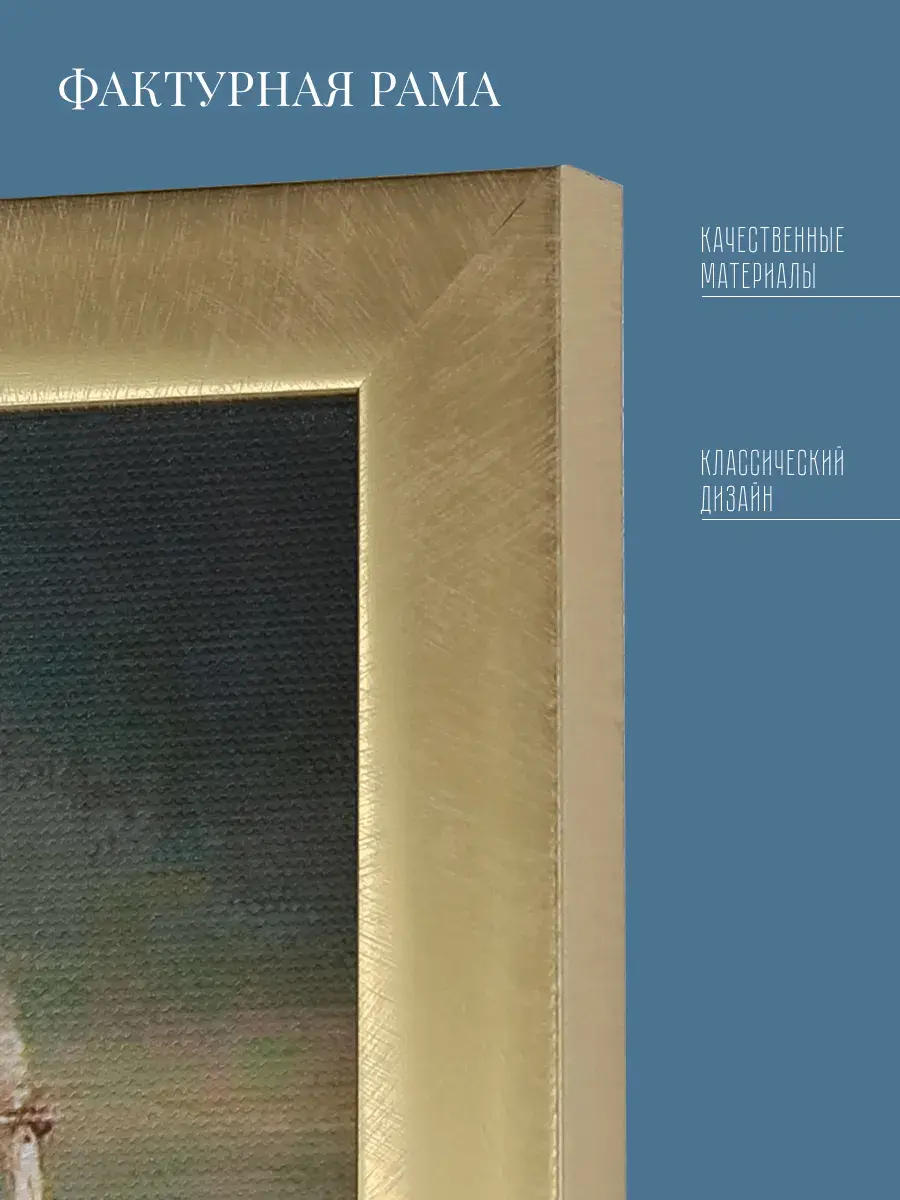 Картины напечатаны на натуральном холсте, покрыты лаком. Основа из ХДФ, что исключает провисание холста. Золотистая багетная рама по периметру картин. Размер каждой картины в раме 33*33 см.