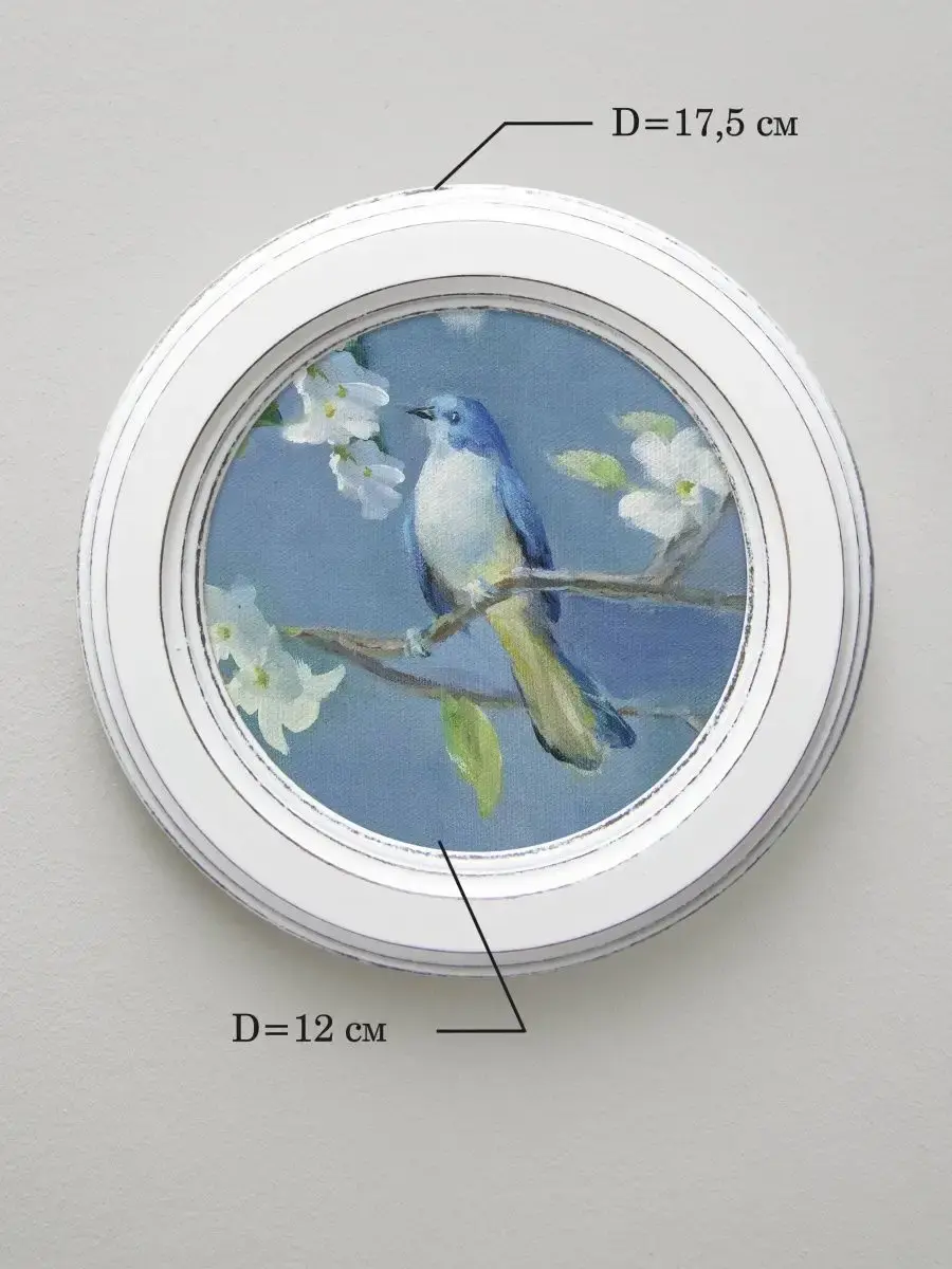 Множество вариантов дает возможность создать собственную коллекцию. Рама изготовлена из цельного листа МДФ 16 мм, не имеет зазоров и стыков. Окрашена экологичной акриловой эмалью в белый, коричневый, мятный цвет или с эффектом старения. Диаметр картины 17,5 см, диаметр изображения 12 см. Крепление для стены и для установки на стол в комплекте.