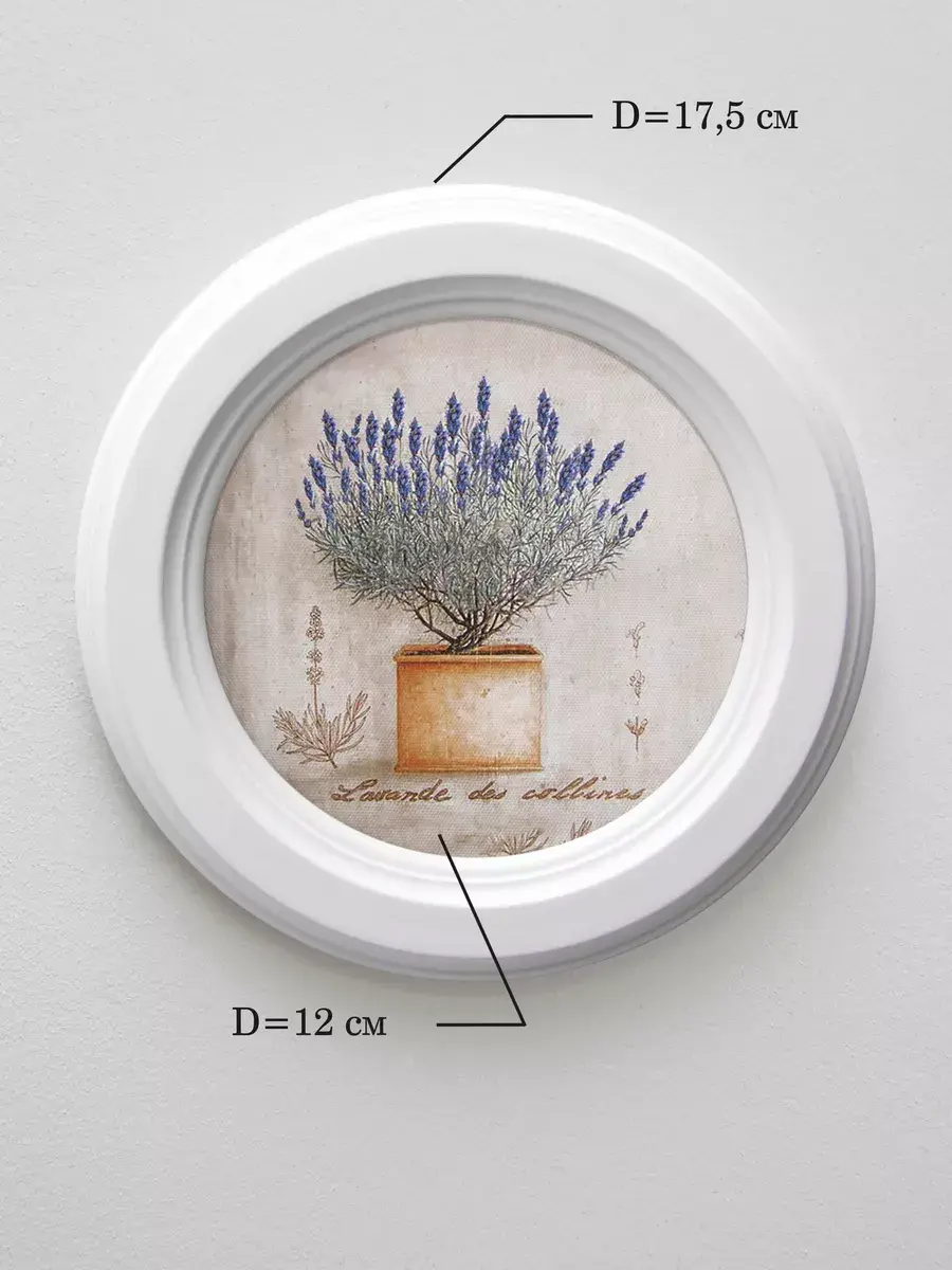 Множество вариантов дает возможность создать собственную коллекцию. Рама изготовлена из цельного листа МДФ 16 мм, не имеет зазоров и стыков. Окрашена экологичной акриловой эмалью в белый, коричневый, мятный цвет или с эффектом старения. Диаметр картины 17,5 см, диаметр изображения 12 см. Крепление для стены и для установки на стол в комплекте.