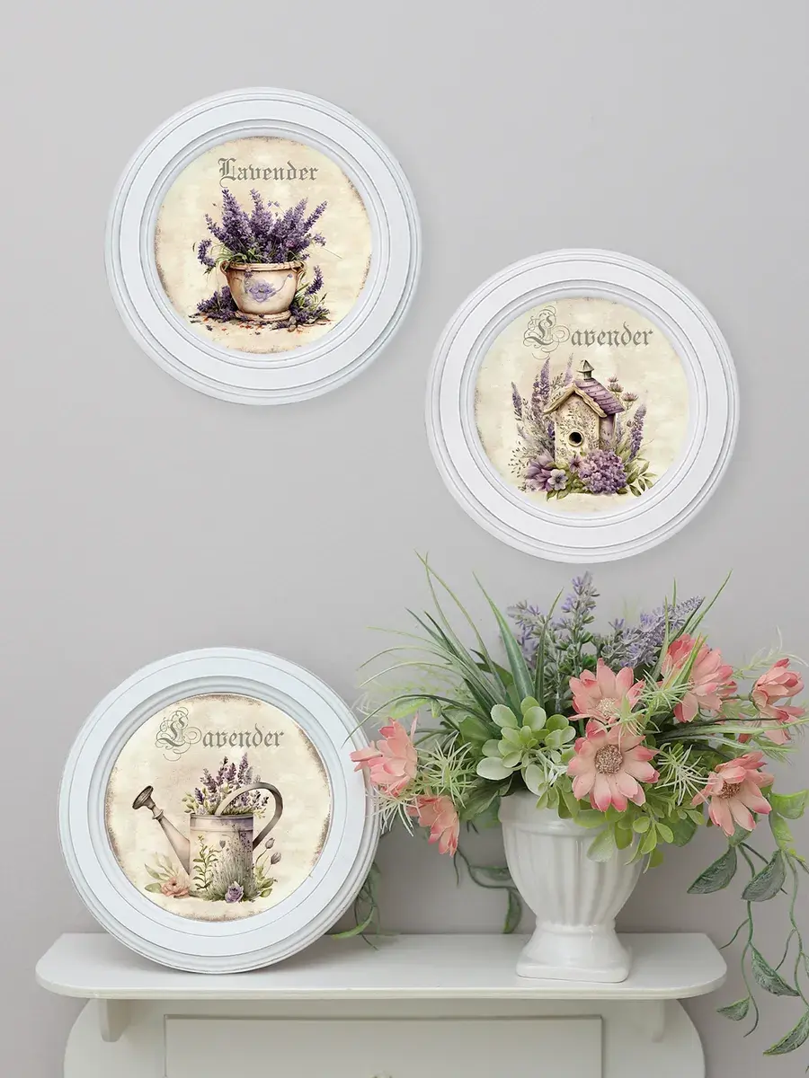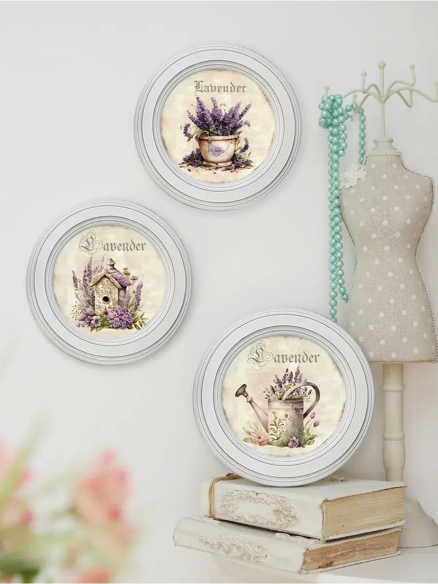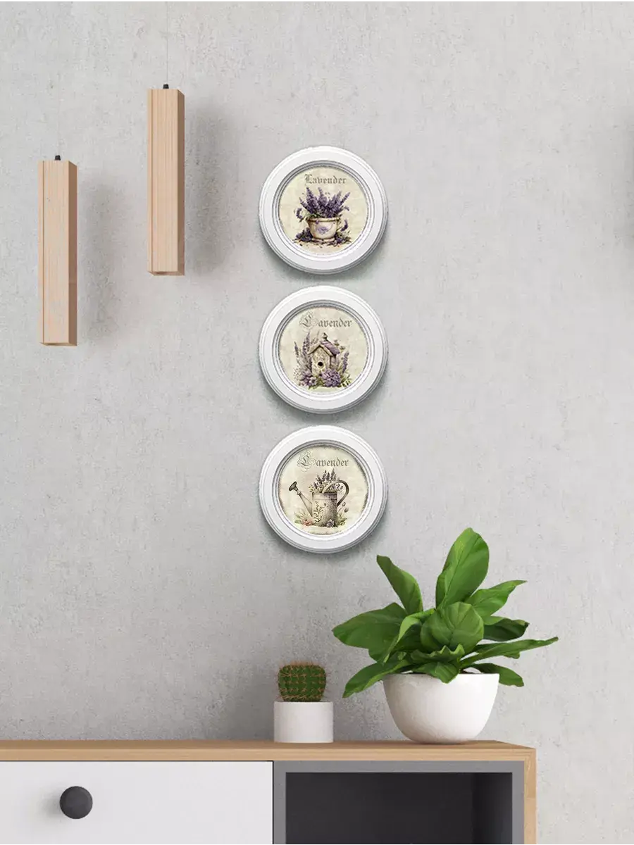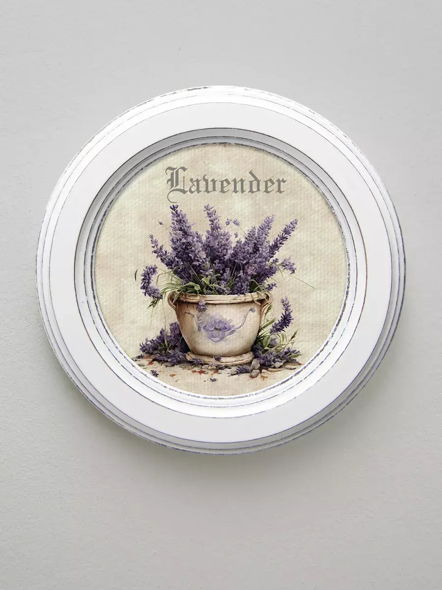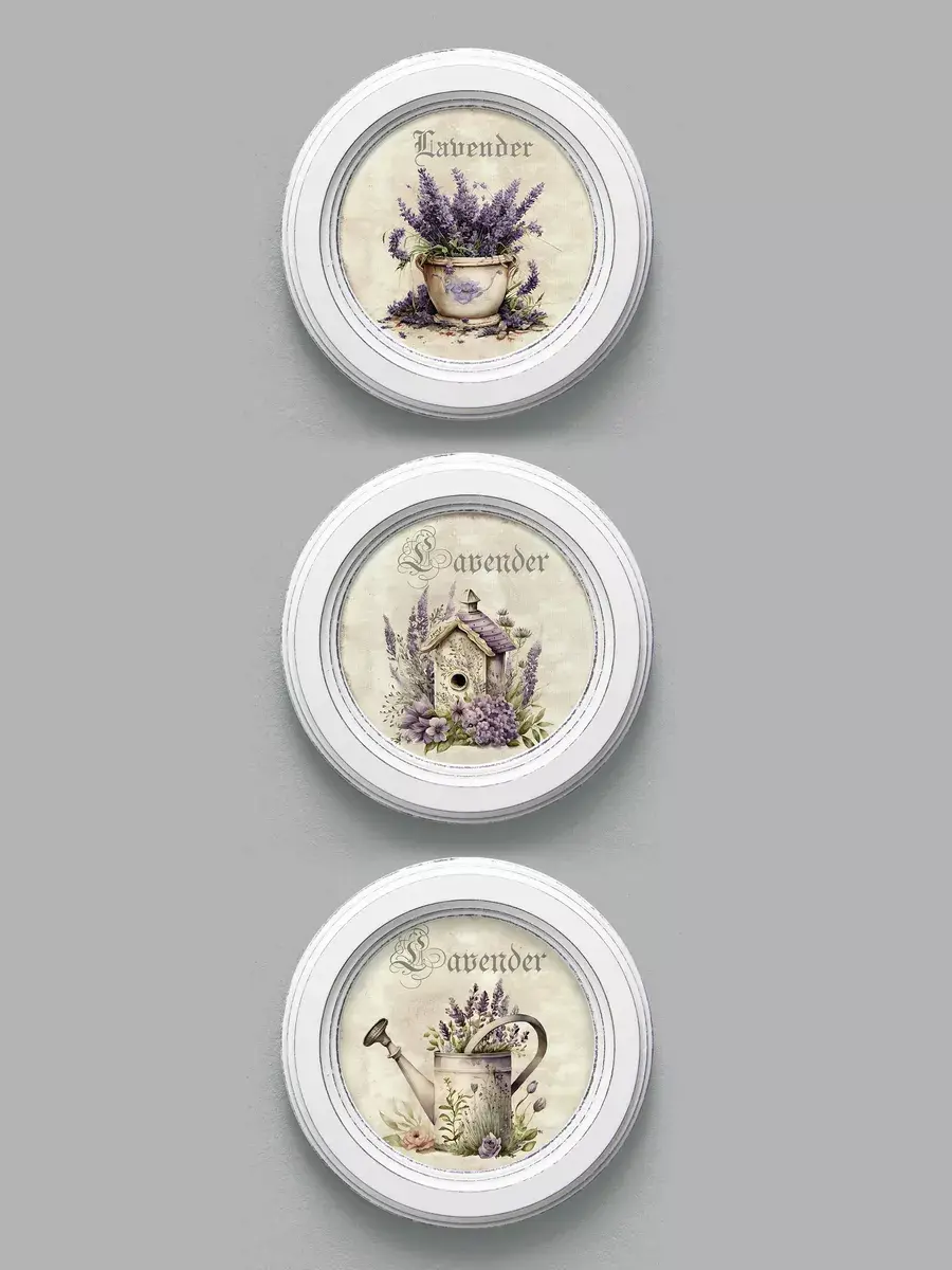 Настенный / настольный декор в стиле прованс с лавандой в белой деревянной раме. Набор из трех картин с разной лавандой для украшения интерьера дома или пасхального стола. Картины напечатаны на натуральном холсте, покрыты матовым лаком в круглой раме станет прекрасным украшением интерьера. Эта картина станет стильным акцентом в интерьере. Она идеально подойдет для оформления стен в различных помещениях: от кухни до спальни, от гостиной до прихожей. Настенное панно выполнено на холсте и отличается яркими цветами, изображающими цветы, что придаст уют и свежесть любому дому или квартире. Декоративное оформление в рамке добавит элегантности и завершенности, делая картину не только предметом декора, но и важной частью атмосферы вашего пространства. Это решение отлично впишется в интерьер офиса, зала или любой комнаты, создавая ощущение счастья и гармонии. Пусть данное предметы искусства придаст вашему дому индивидуальность и изысканный стиль.