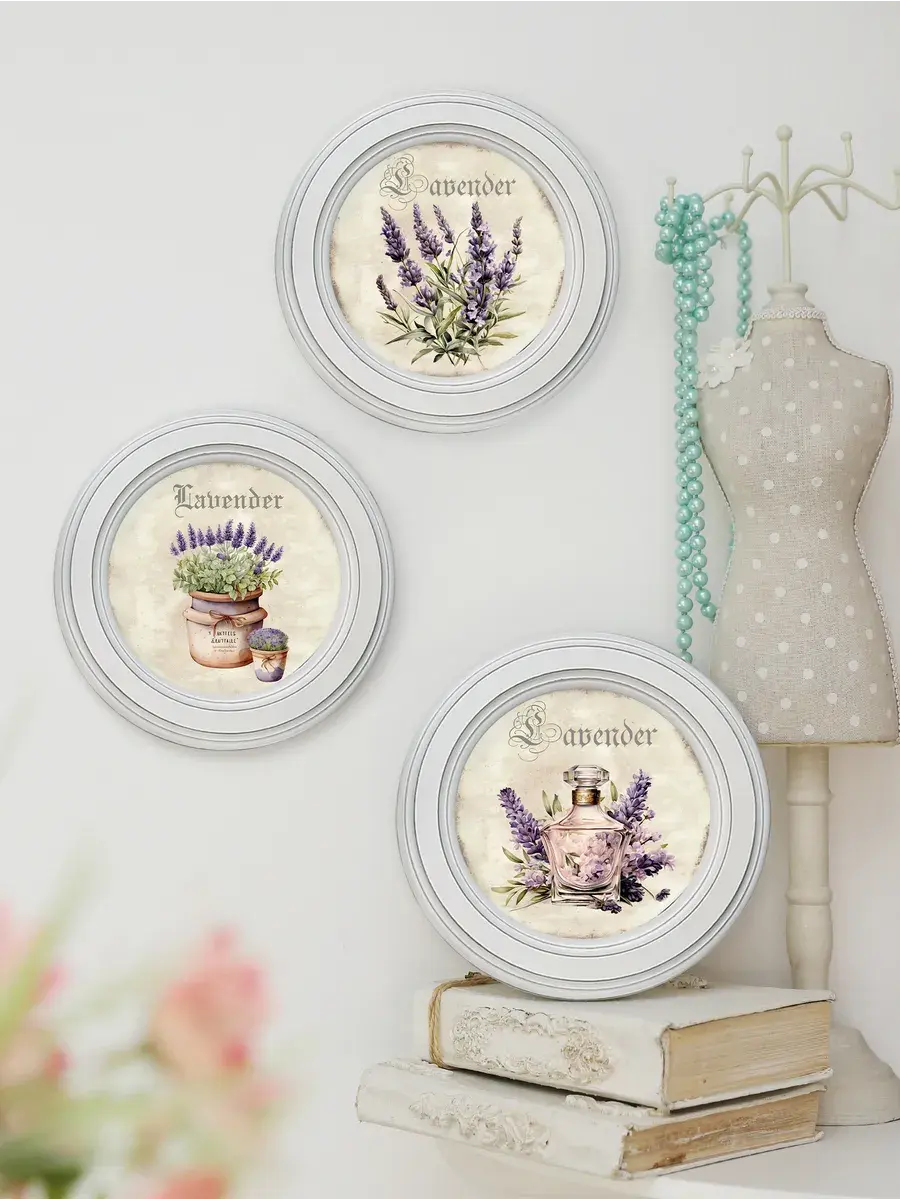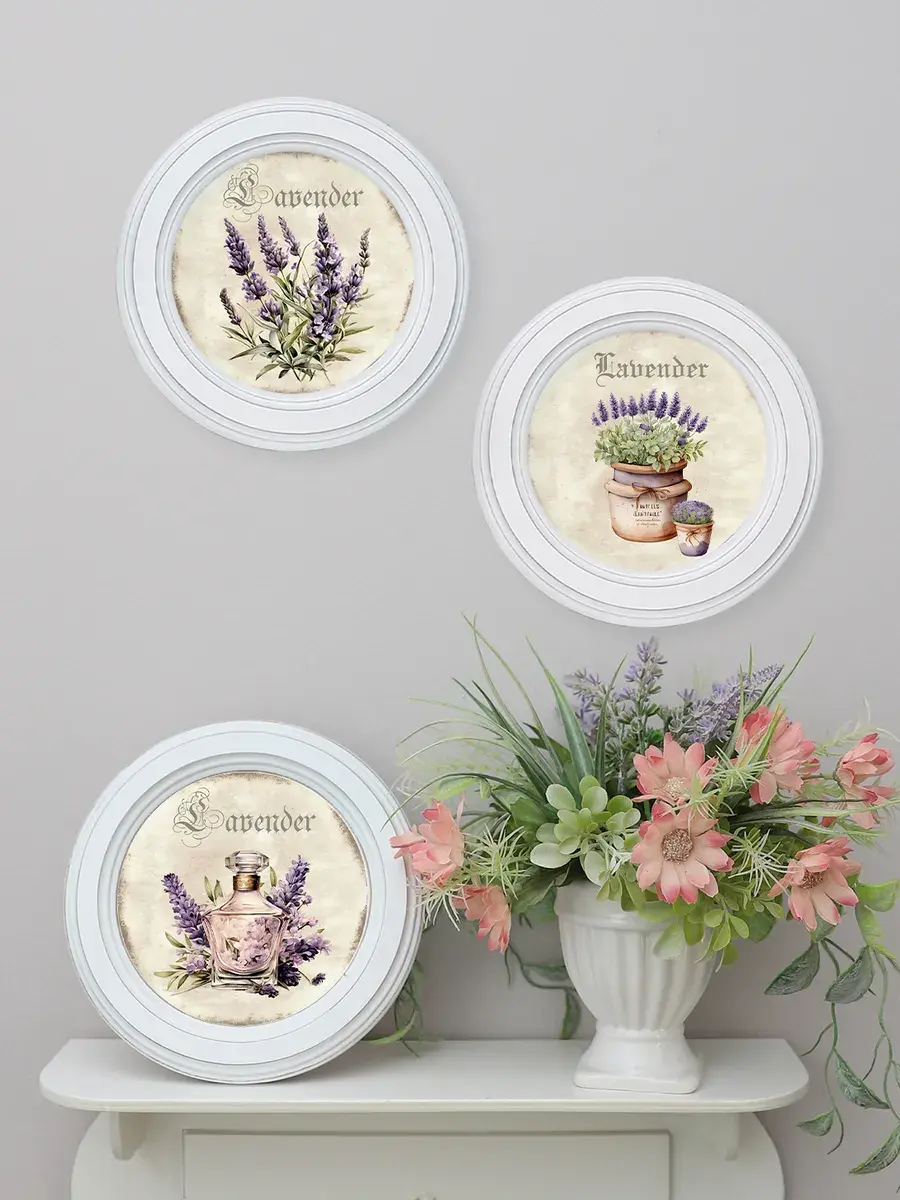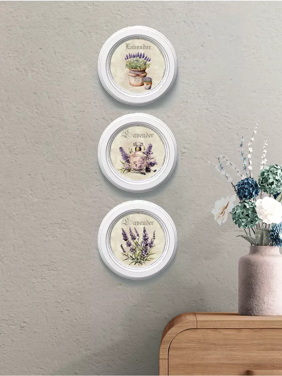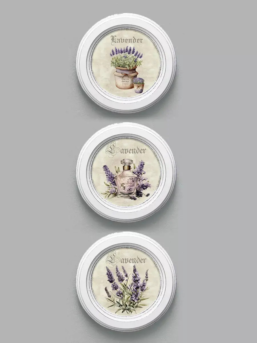 Настенный / настольный декор в стиле прованс с лавандой в белой деревянной раме. Набор из трех картин с разной лавандой для украшения интерьера дома или пасхального стола. Картины напечатаны на натуральном холсте, покрыты матовым лаком в круглой раме станет прекрасным украшением интерьера. Эта картина станет стильным акцентом в интерьере. Она идеально подойдет для оформления стен в различных помещениях: от кухни до спальни, от гостиной до прихожей. Настенное панно выполнено на холсте и отличается яркими цветами, изображающими цветы, что придаст уют и свежесть любому дому или квартире. Декоративное оформление в рамке добавит элегантности и завершенности, делая картину не только предметом декора, но и важной частью атмосферы вашего пространства. Это решение отлично впишется в интерьер офиса, зала или любой комнаты, создавая ощущение счастья и гармонии. Пусть данное предметы искусства придаст вашему дому индивидуальность и изысканный стиль.